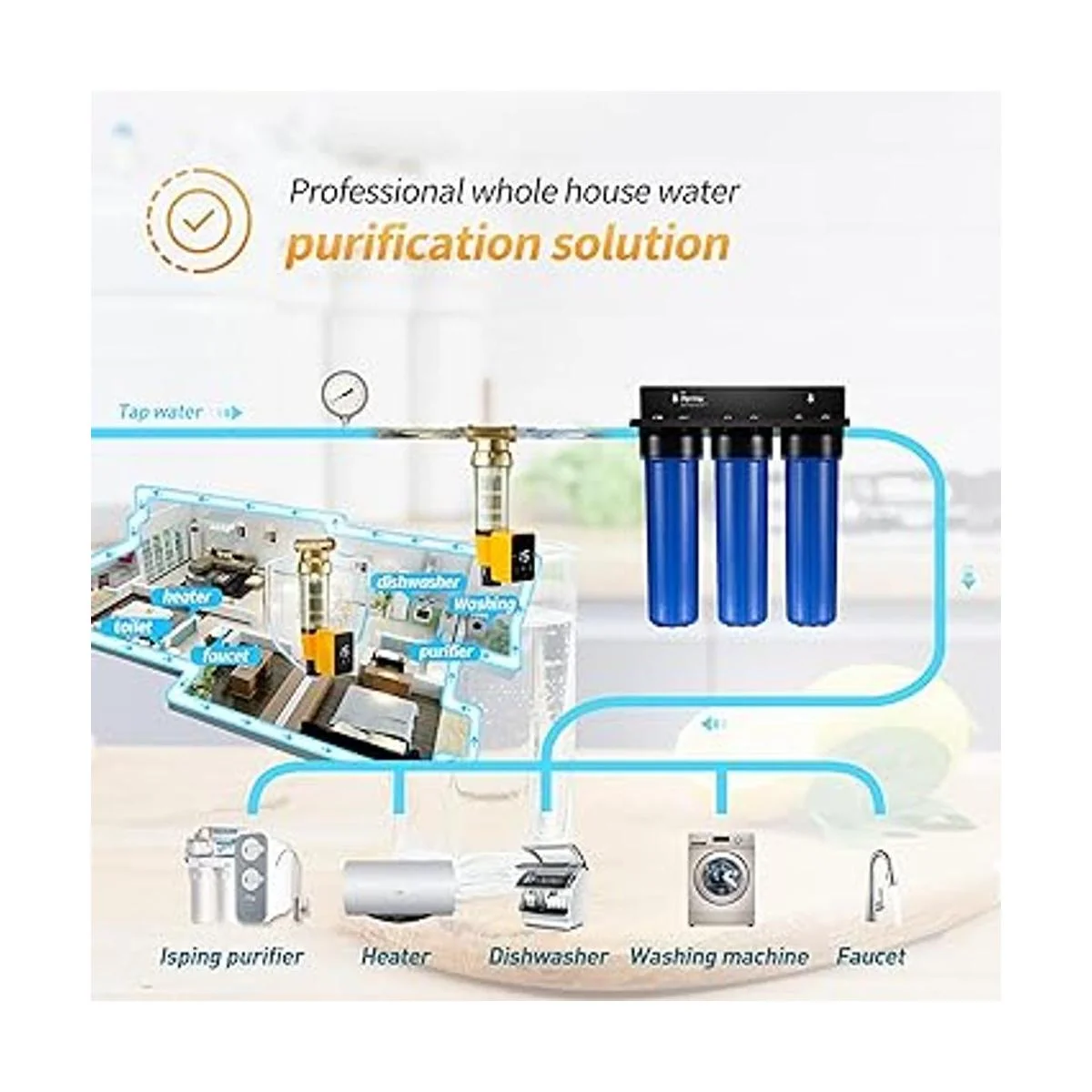 Desechable y reutilizable: todo el filtro de agua de sedimentos giratorios de toda la casa se utiliza para crear un sistema de filtración de gradiente multicapa que elimina una carga de trabajo considerable de filtros más finos que lo siguen y dan como resultado una vida útil más larga del filtro. Como una versión más grande y mejorada de la serie WSP, WSP50ARB filtra partículas, sedimentos, óxido y objetos flotantes