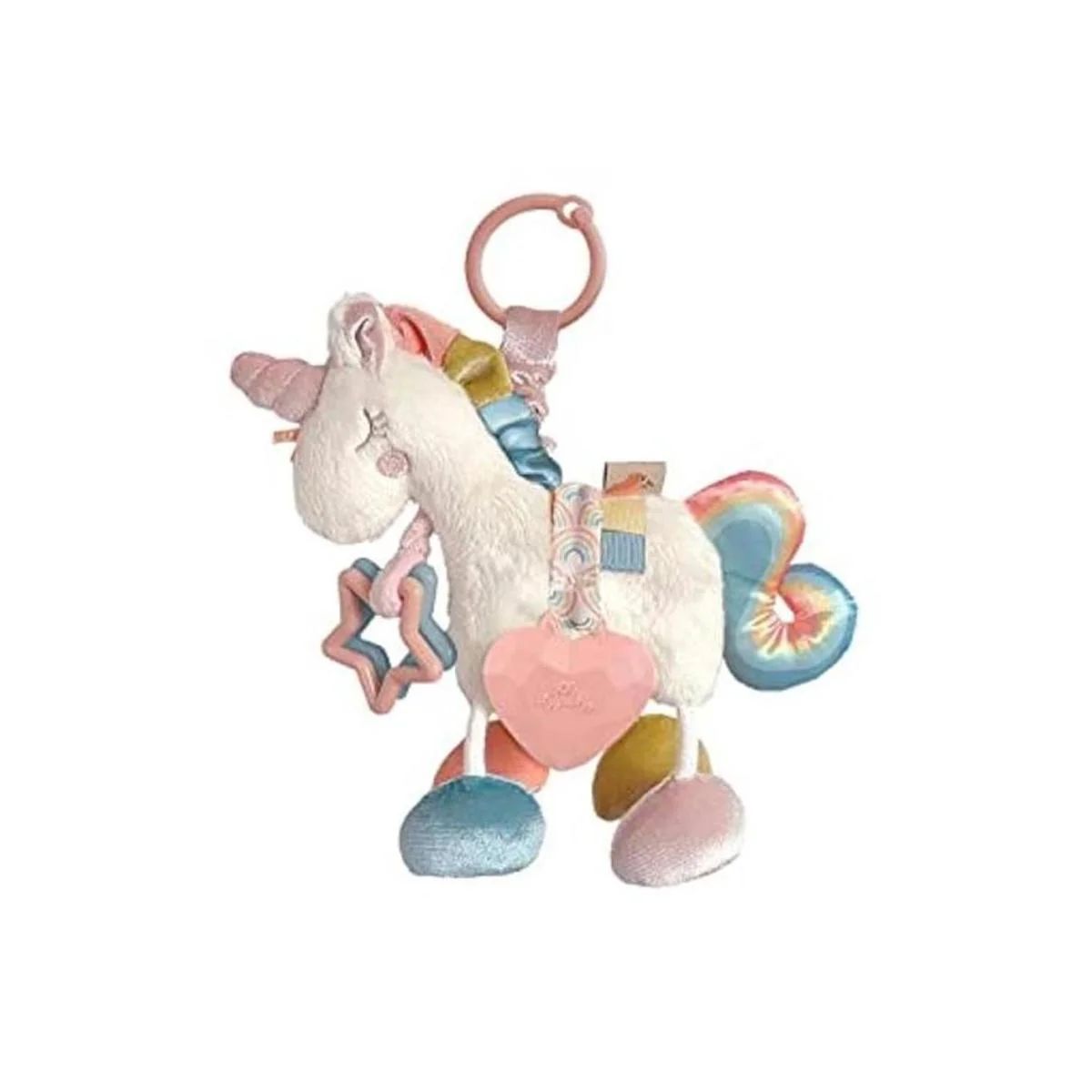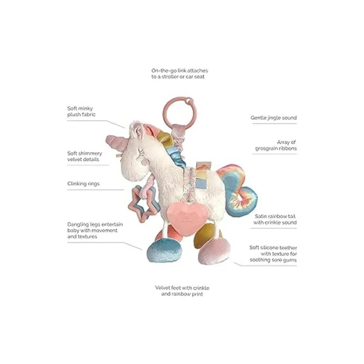 Itzy Ritzy Link Love Juguete para cochecito, asiento de automóvil o gimnasio de actividades, cuenta con cintas texturizadas, sonidos arrugados, anillos de sujeción y mordedor de silicona, unicornio