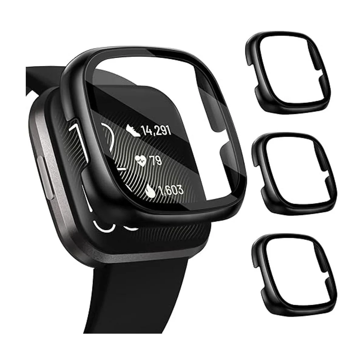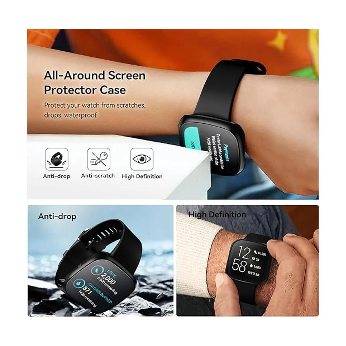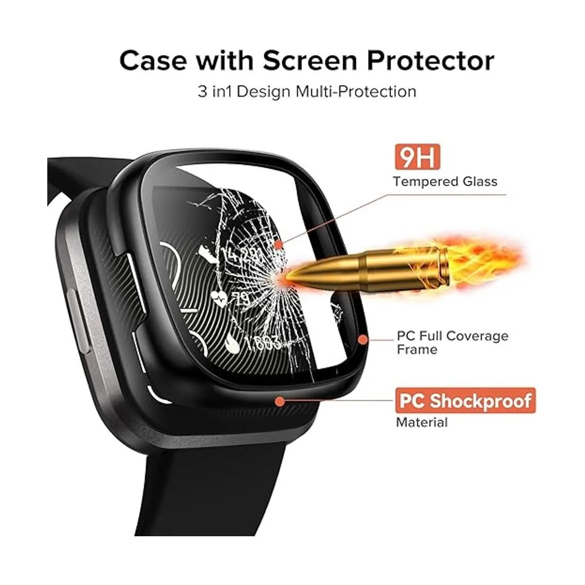 iVoler Protector de pantalla de vidrio templado para Fitbit Versa 2, carcasa rígida de policarbonato con cubierta de parachoques sensible al tacto, cobertura completa, funda protectora para reloj inteligente Versa 2, color negro