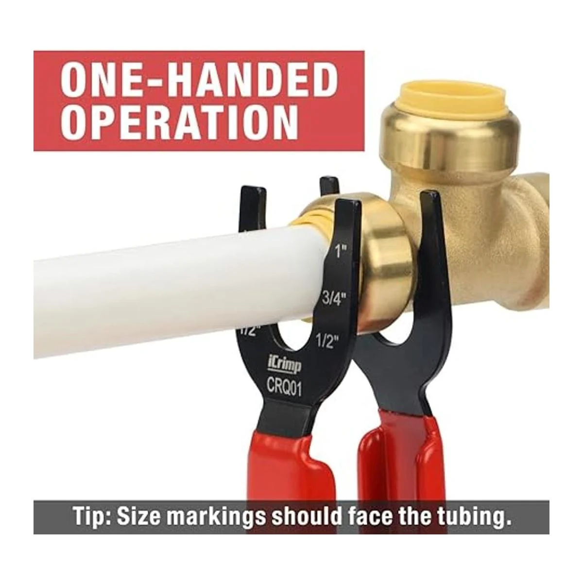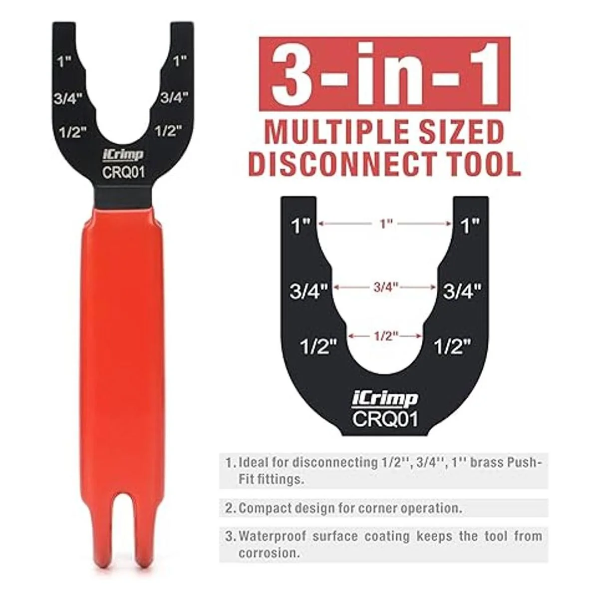 La herramienta de desconexión de ajuste a presión CRQ01 tiene 3 dientes disponibles en 1/2 pulgadas, 3/4 pulgadas. y 1.0 in. tamaños, permite una fácil extracción del accesorio de latón para conectar del tubo