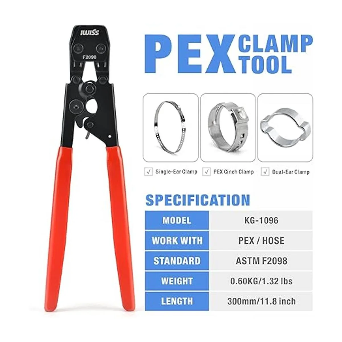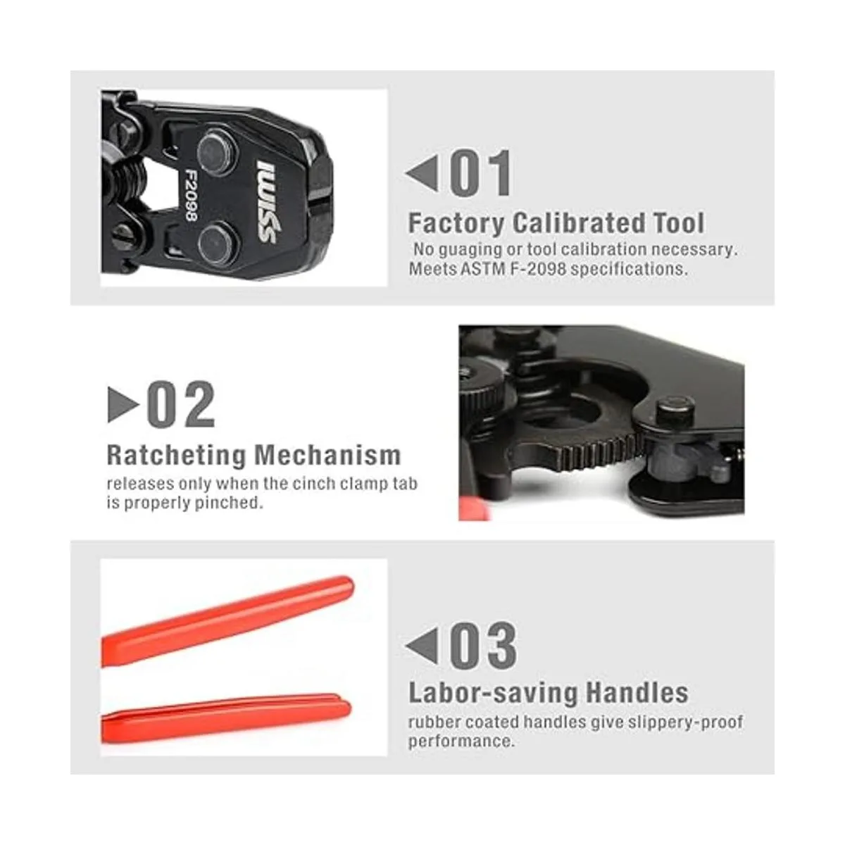 IWISS PEX Alicate para fijar abrazaderas, para abrazaderas de 38 a 1 pulgadas, con calibre de prueba y error. Juego de 20 piezas de 12 pulgadas y 10 piezas de 34 pulgadas. Las abrazaderas sirven para Sharkbite, Vatios, Apollo y todos los F2098 estándar de Estados Unidos.