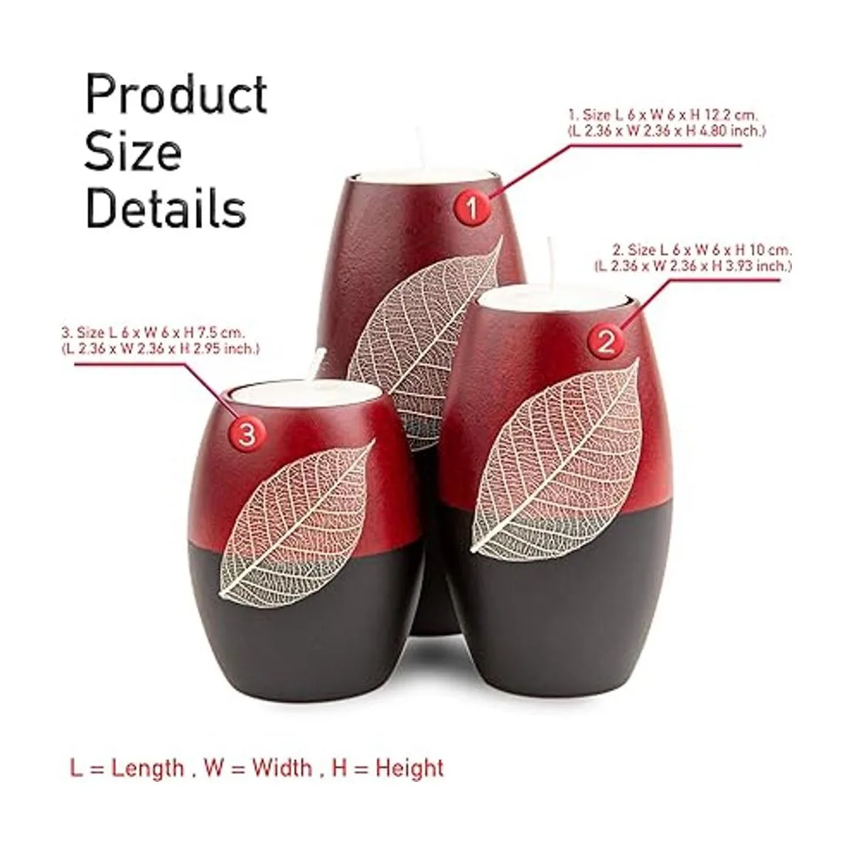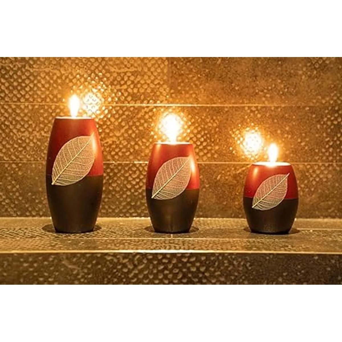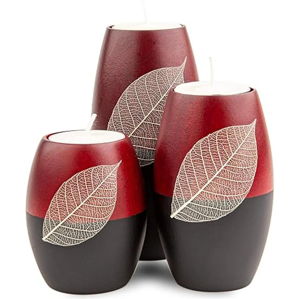 IYARA CRAFT 3 portavelas de madera decorativos con hoja seca de decoración de belleza, detalles intrincados, acabado de madera mate, ideal para entornos modernos y rústicos de 2 tonos, rojo, negro forma de rugby