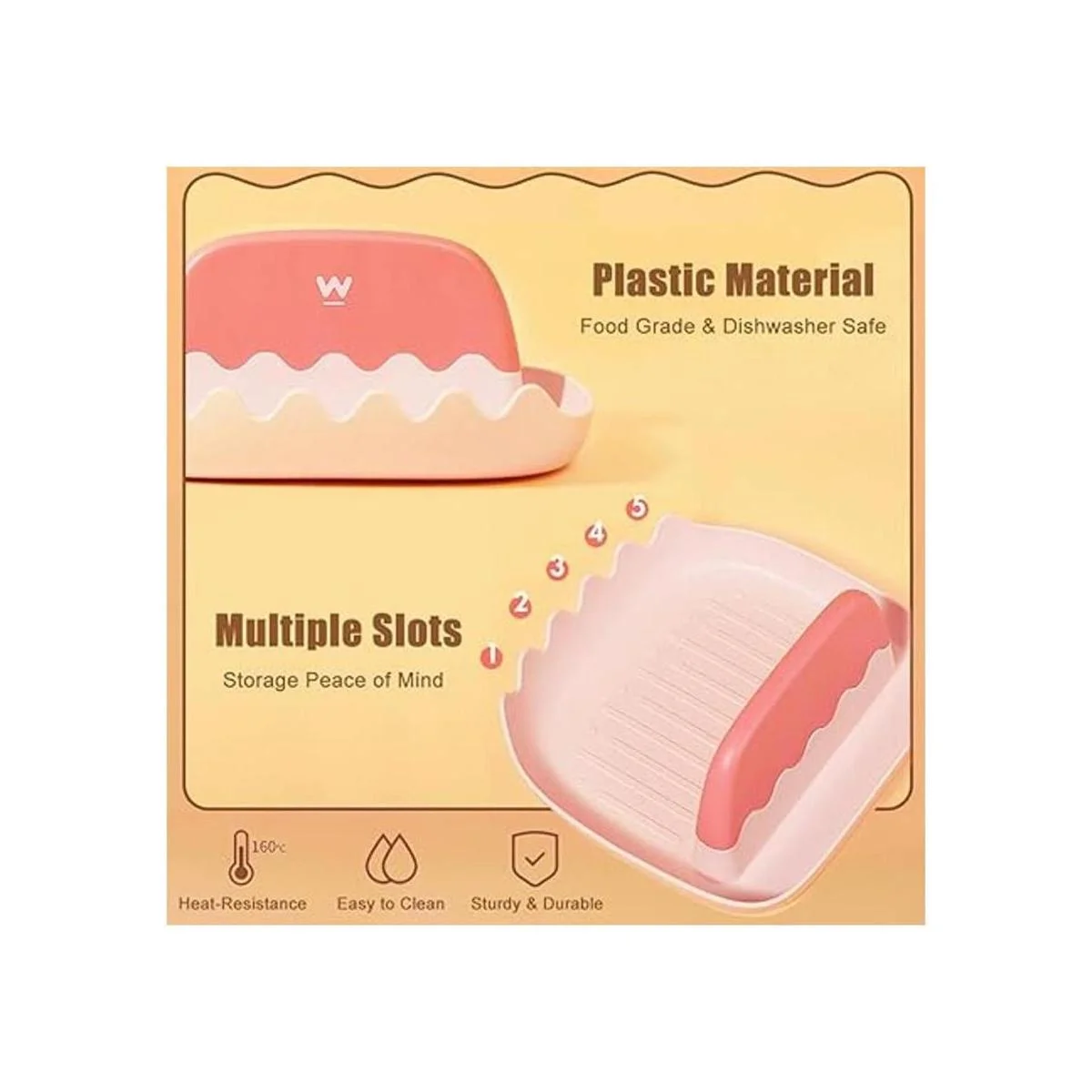 Material 100 de grado alimenticio: el soporte para cucharas de estufa está hecho de plástico sin BPA de la más alta calidad, un material de grado alimenticio para hacer pajitas, loncheras, tazas de agua, etc. El soporte para cucharas de cocina es resistente al calor hasta 320.0 F y apto para lavavajillas para una fácil limpieza.