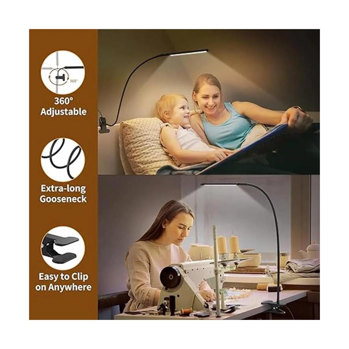 Cuello de cisne flexible y clip resistente: este clip de luz negra tiene una longitud de 15.8 pulgadas de tubo de cuello de cisne flexible de 360, lo que te permite ajustar fácilmente la dirección de la luz, así como la altura y la distancia. La abrazadera resistente se puede abrir hasta 2.3 pulgadas, lo que es muy fácil de enganchar en cualquier lugar que desees, no solo para mesas, camas y cabeceros.