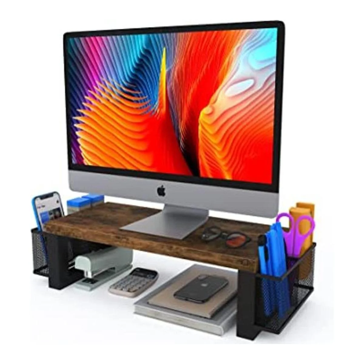 Soporte para monitor de computadora con almacenamiento: integrado en 2 soportes de almacenamiento en ambos lados. Ideal para organizar suministros de oficina y accesorios. Mientras que espacio adicional del soporte debajo para almacenamiento. Una forma útil de ahorrar espacio y disminuir el desorden.