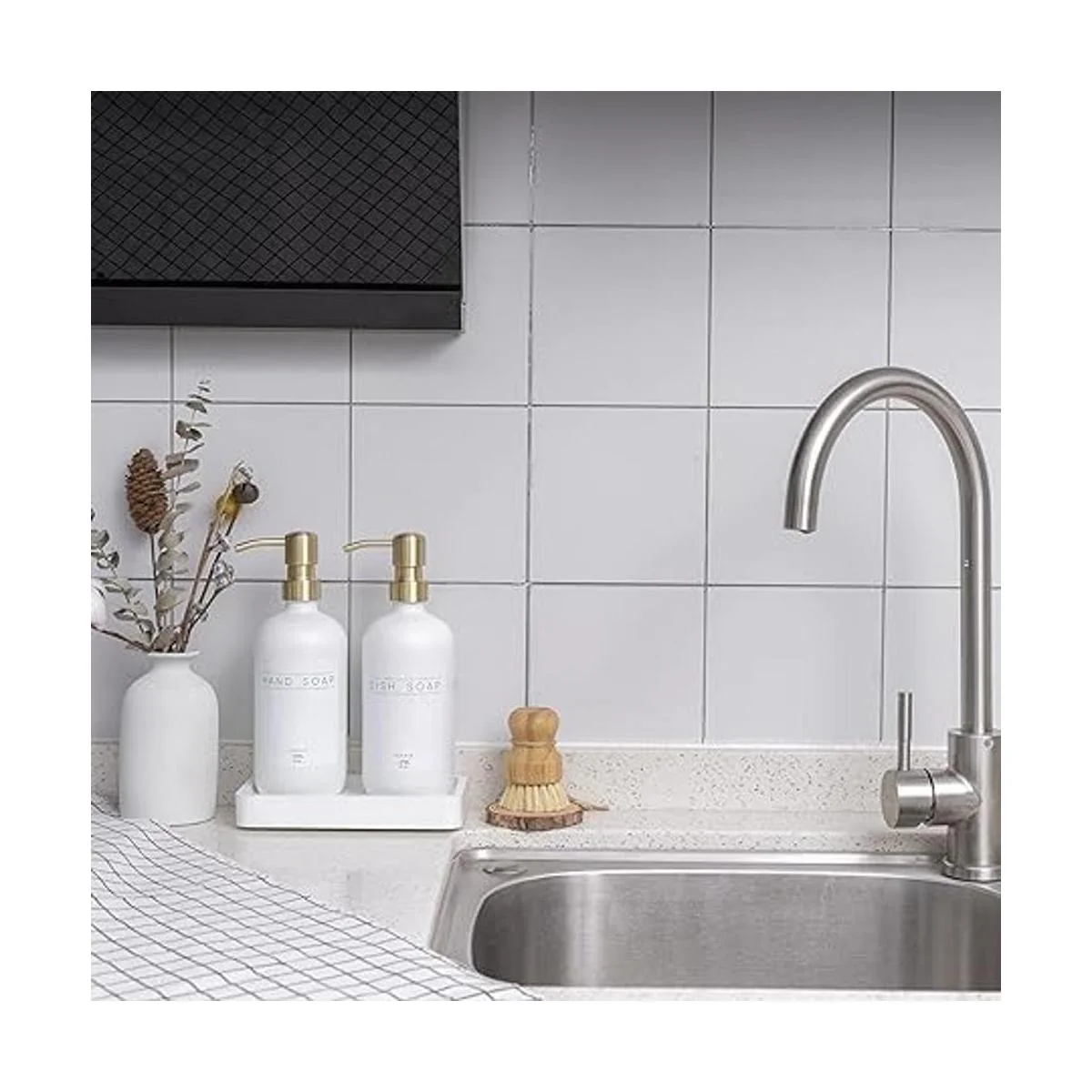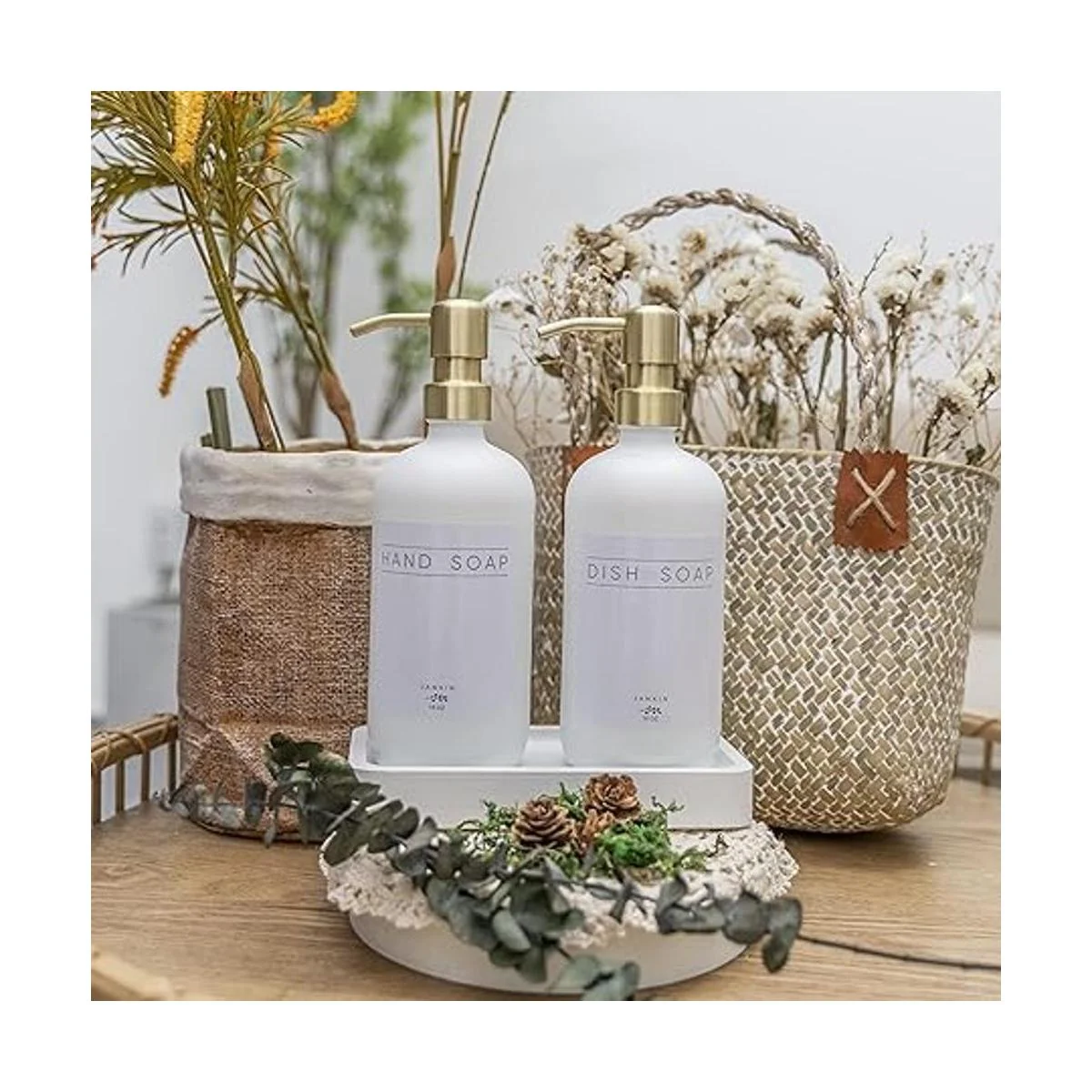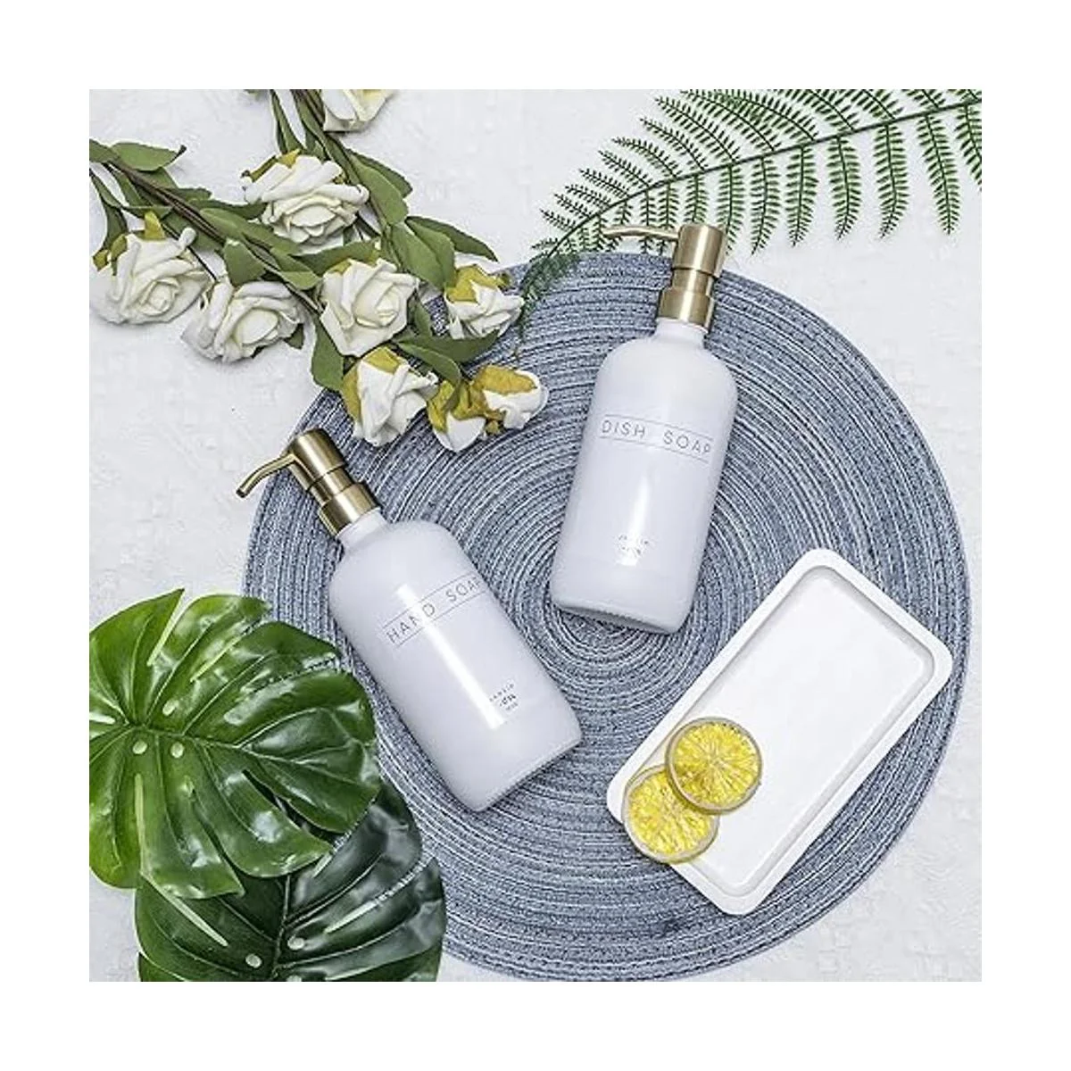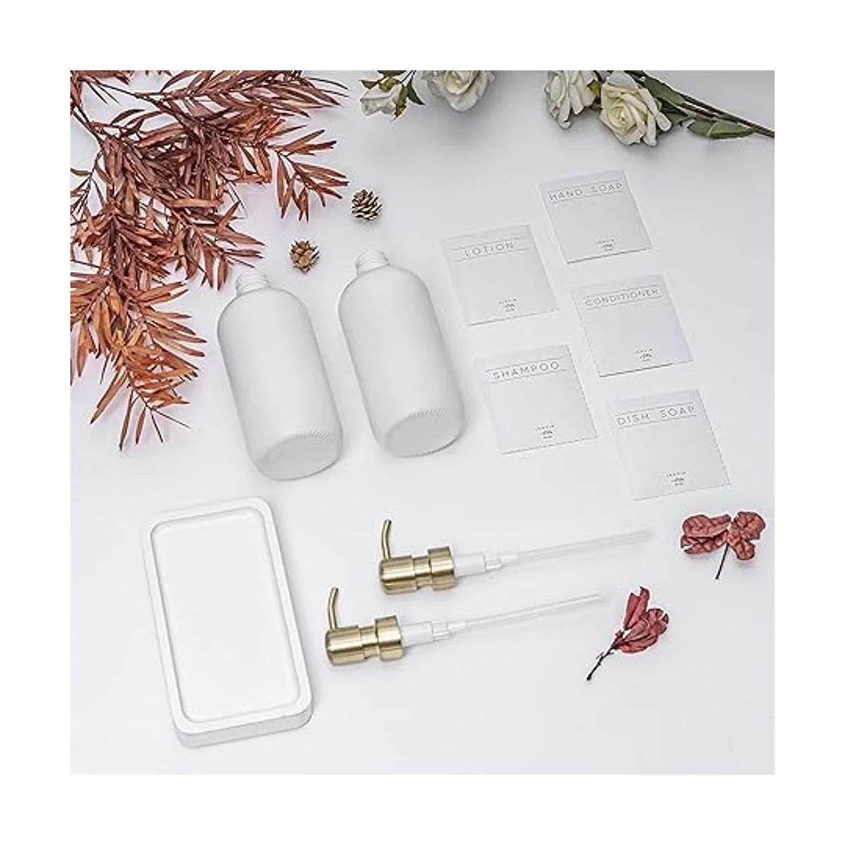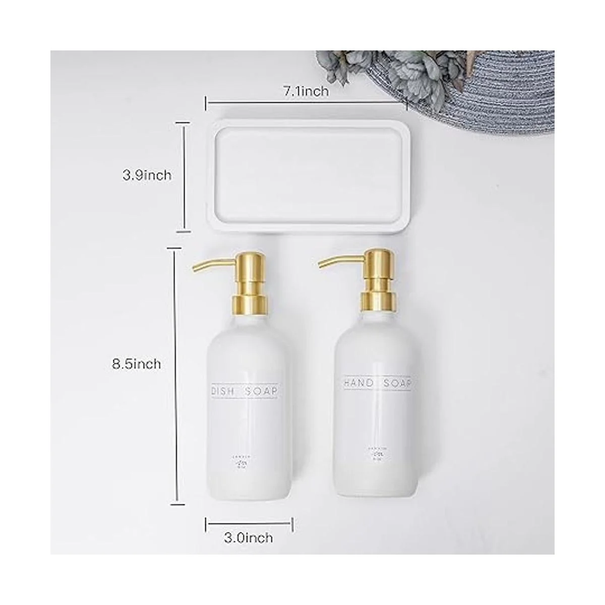 El juego de dispensador de jabón incluye 2 botellas de vidrio blanco grueso sin BPA de 16 onzas con bomba de acero inoxidable dorado, 1 bandeja dispensadora de jabón de madera hecha a mano, 1 embudo de silicona plegable, 5 etiquetas impermeables de alta calidad jabón de manos, jabón de platos, loción, champú y acondicionador.