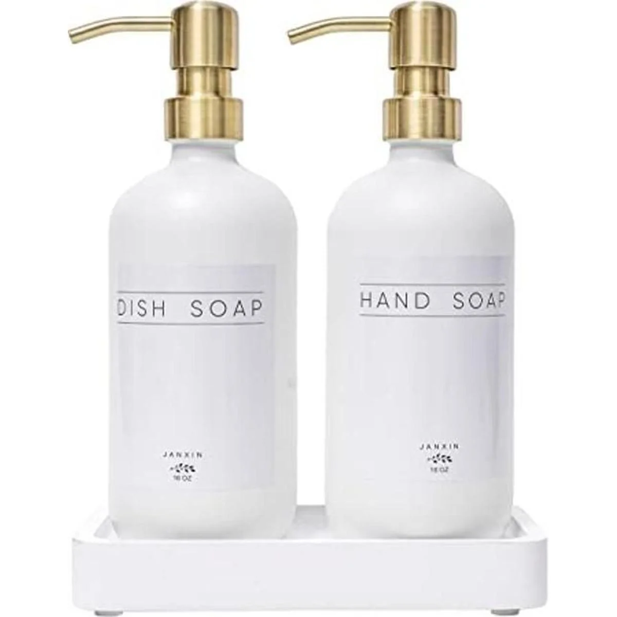 Janxin Dispensador de jabón de vidrio para cocina con bomba de acero inoxidable y bandeja de madera, dispensador de jabón de baño moderno con etiquetas impermeables para jabón de manos, jabón de platos, loción botellas blancas bombas doradas