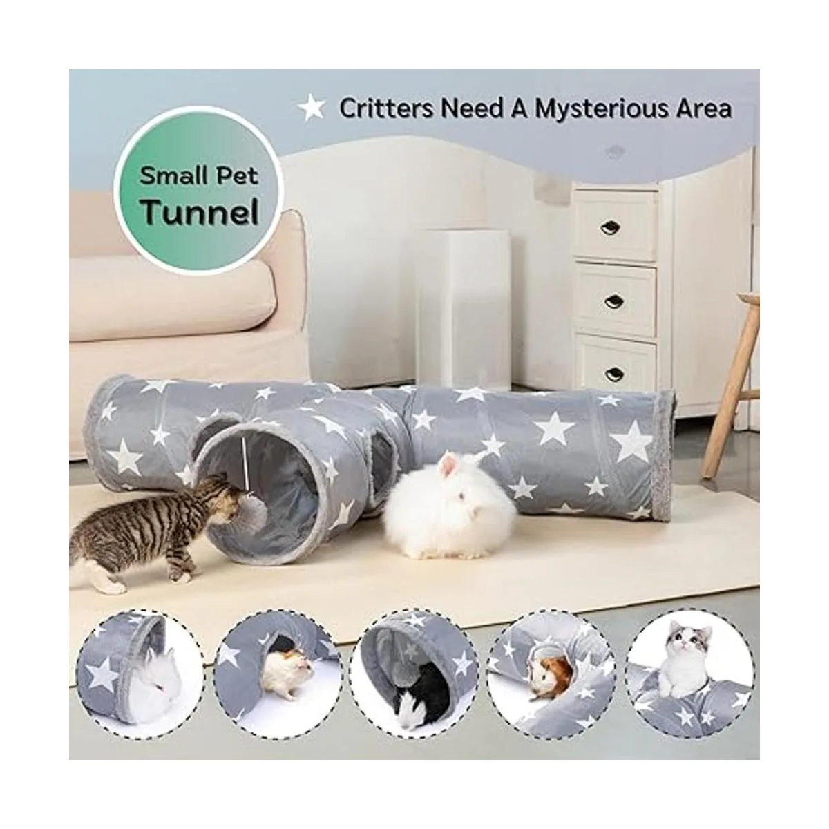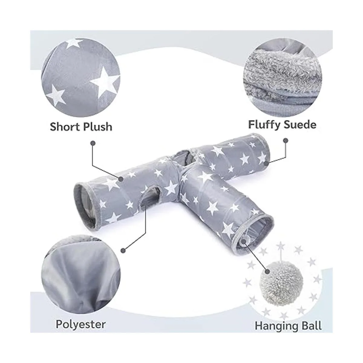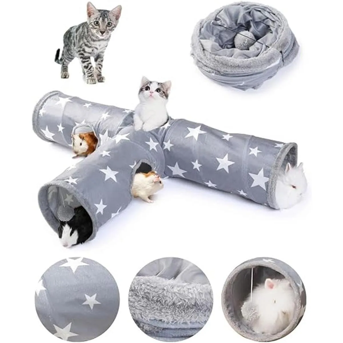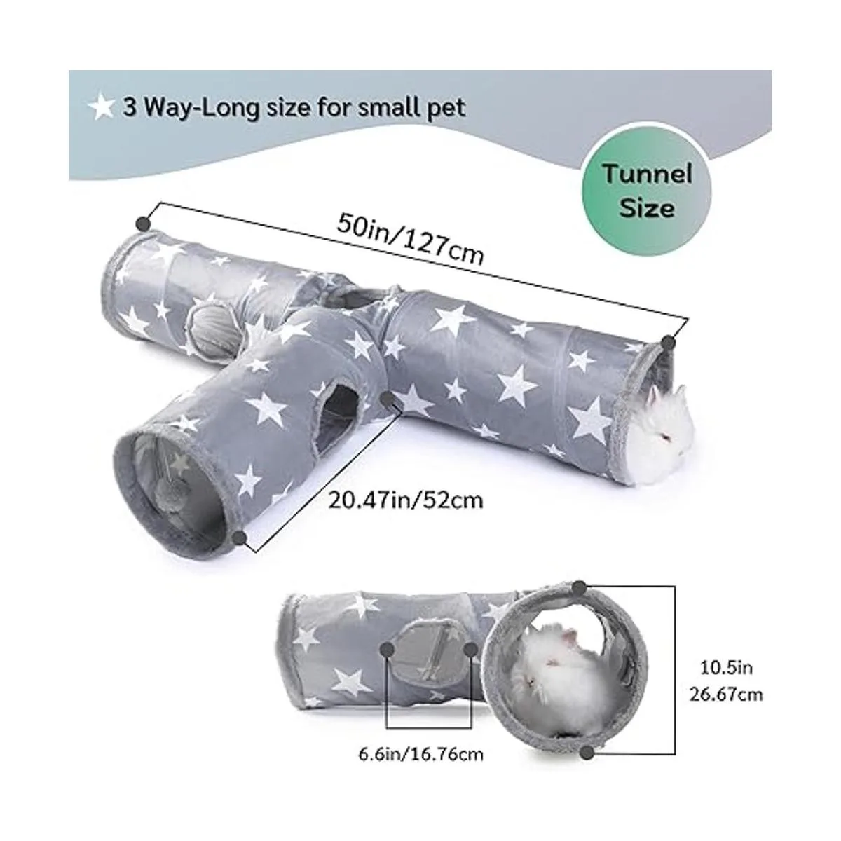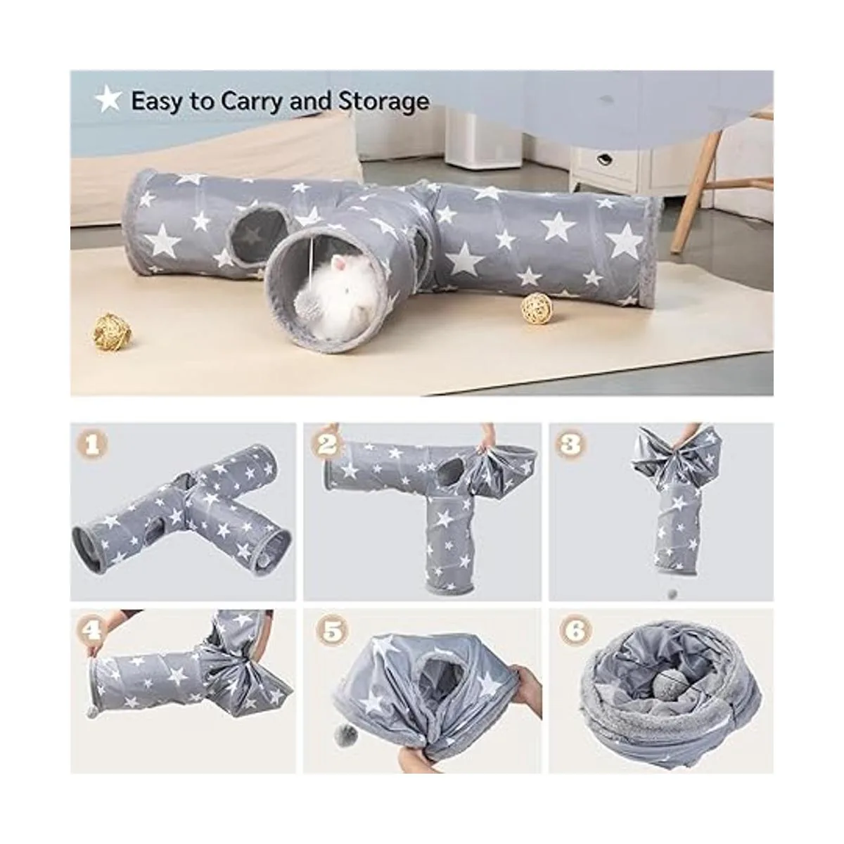 Material: el túnel de conejo está hecho de tela superior de algodón mezclado de alta calidad y tela interior de filamento de poliéster utiliza tela de doble capa, los agujeros están cubiertos con gamuza esponjosa. No hay olor extraño, no tóxico, sin ruido excesivo, el túnel no se ensucia fácilmente, fácil de limpiar y se puede lavar a mano