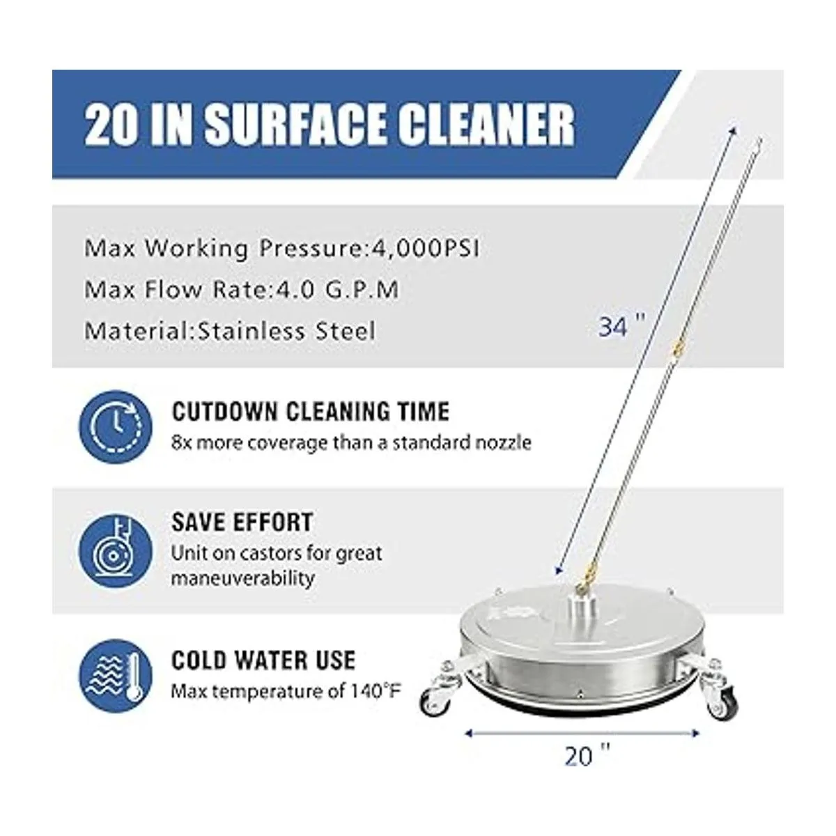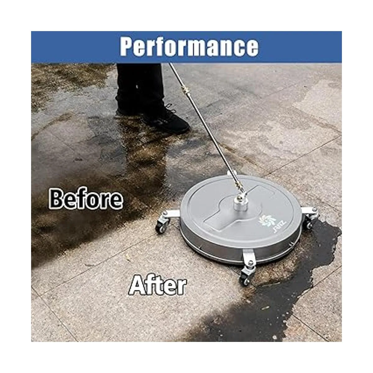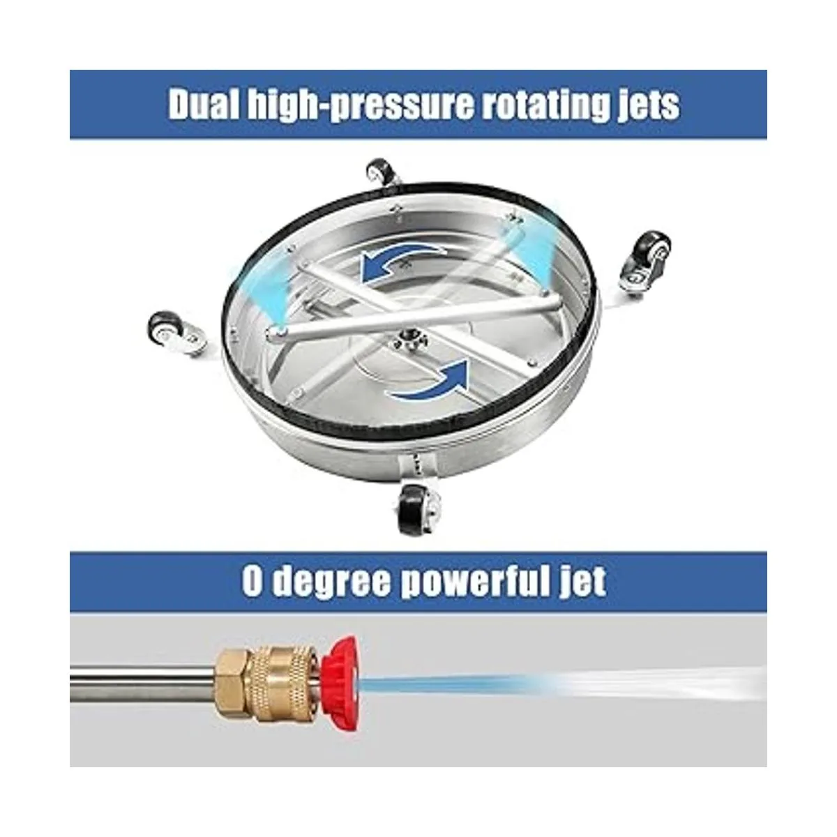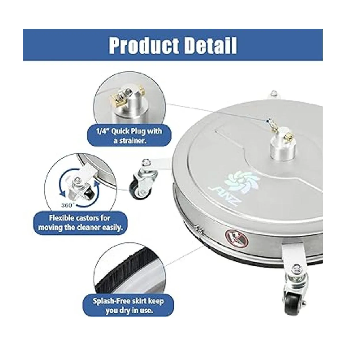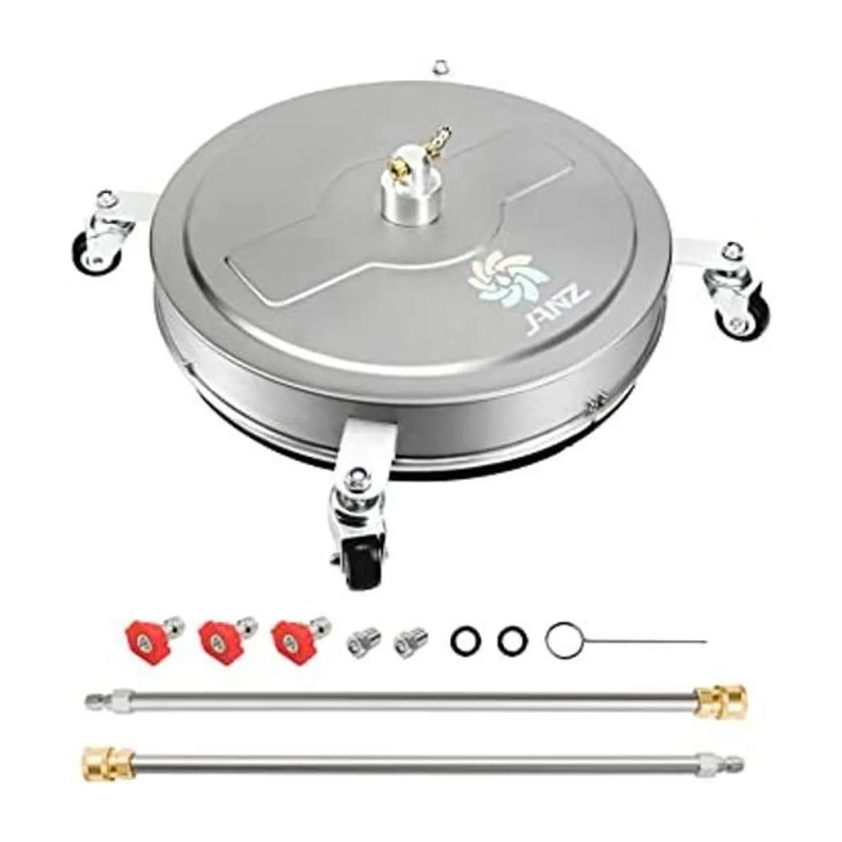 JANZ Limpiador de superficies de lavadora a presión de 20 pulgadas con 4 ruedas, carcasa de acero inoxidable, enchufe rápido de 14 pulgadas, 2 varitas de extensión, 2 boquillas de repuesto y 3 boquillas de pulverización, 4000 PSI