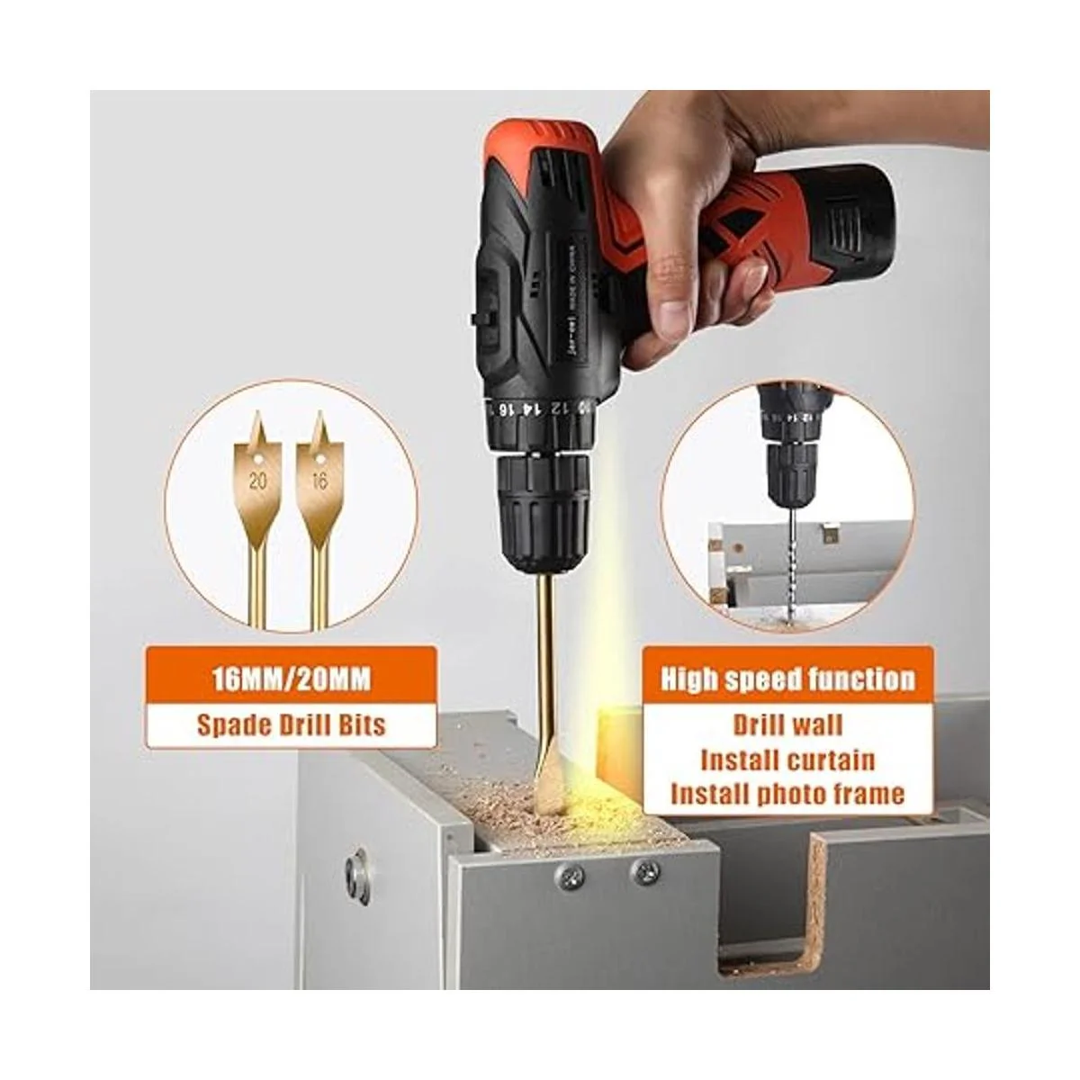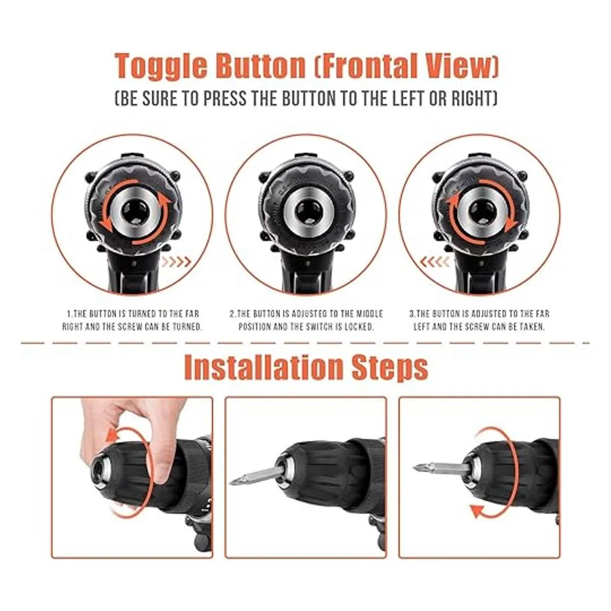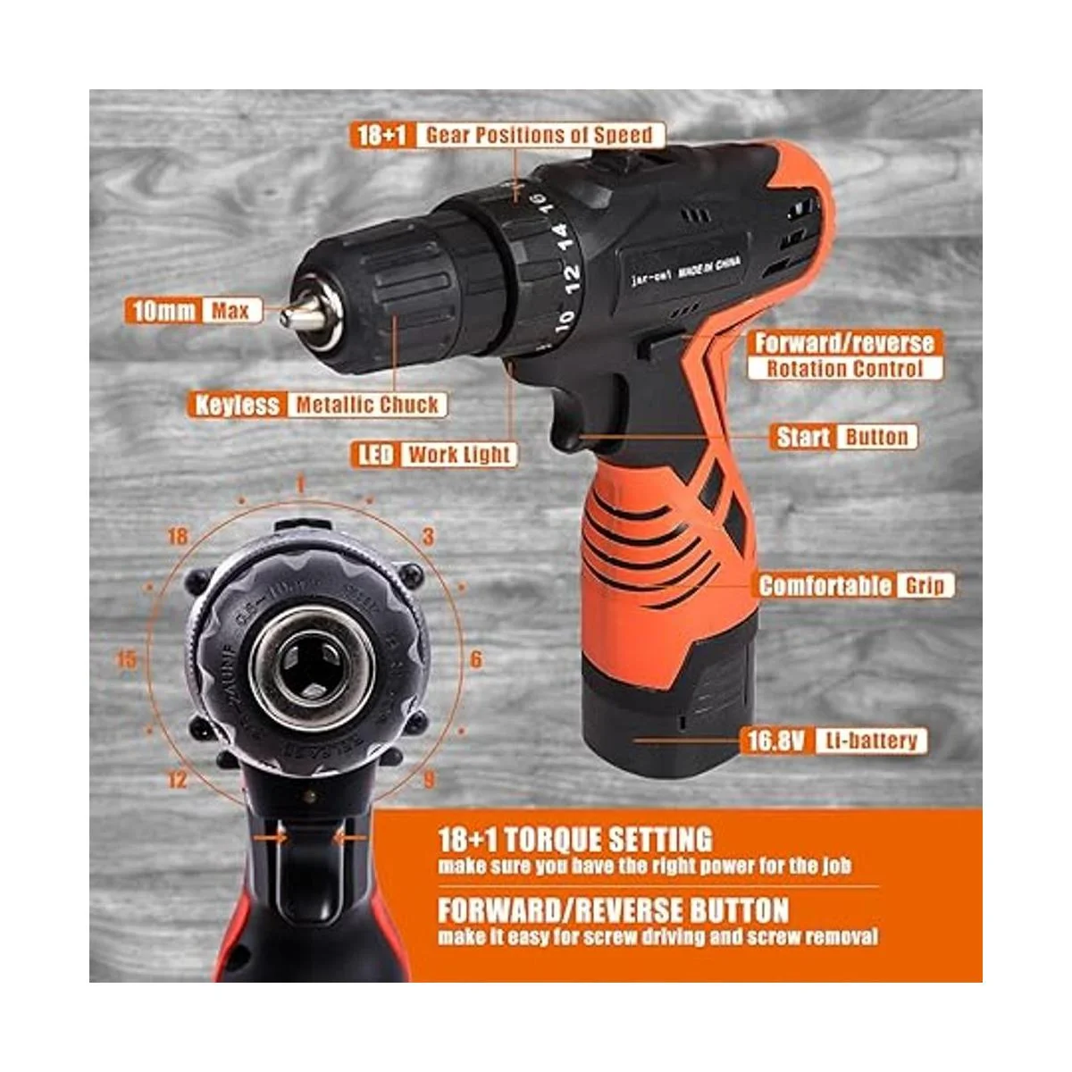 Kit combinado de herramientas eléctricas con taladro inalámbrico de 16.8 V. Para taladrar madera, metal y plásticos, mientras que puedes utilizar el gatillo de velocidad variable hacia adelante e inversa para controlar fácilmente las velocidades de perforación y invertir las brocas, un botón de bloqueo proporciona facilidad de perforación continua.