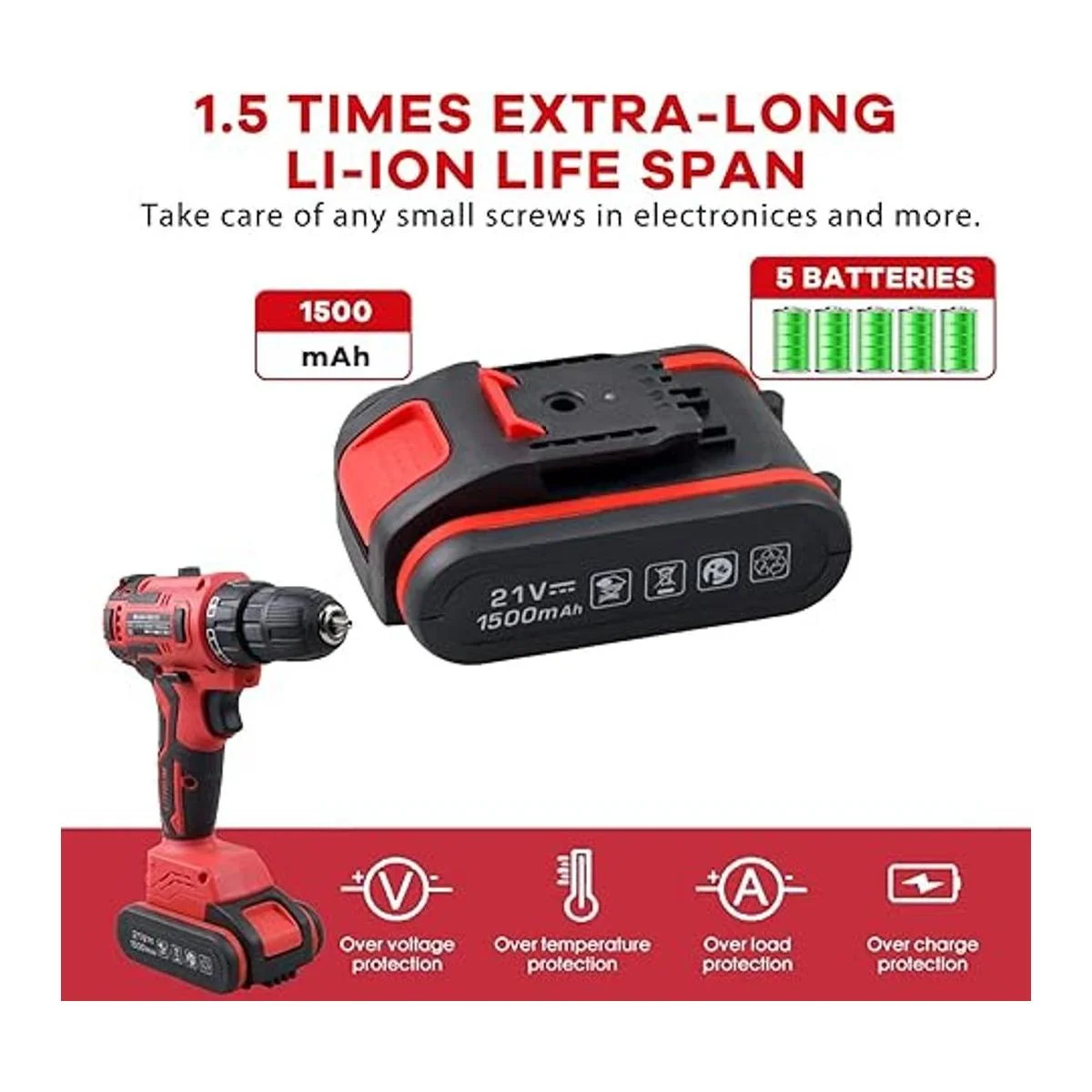 Taladro inalámbrico de 21 V con batería de 1,5 Ah. Nuestra caja de herramientas con taladro también está equipada con baterías recargables de níquel cadmio de 1500 mAh incluyendo cargadores se puede cargar en 3 a 5 horas, y puede llevar a cabo un gran número de ciclos de carga y descarga.