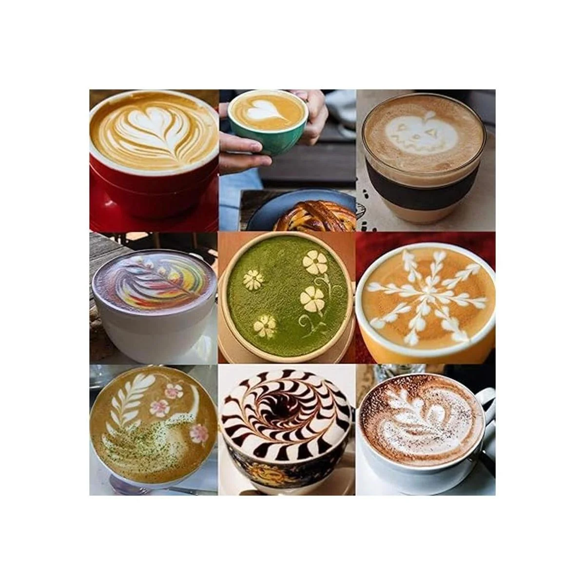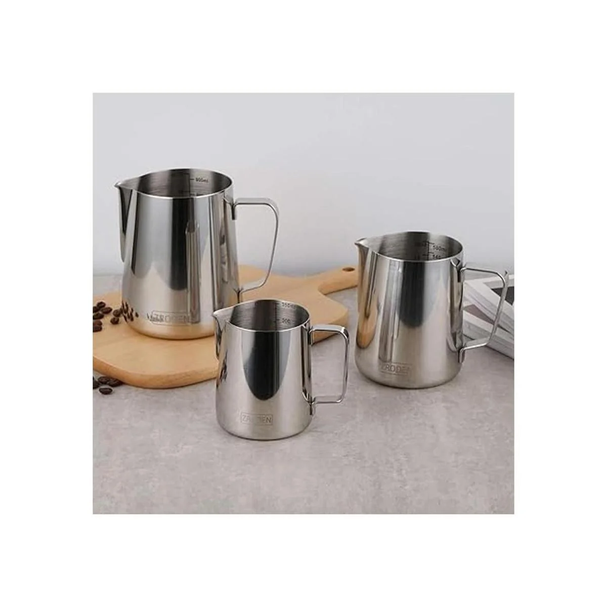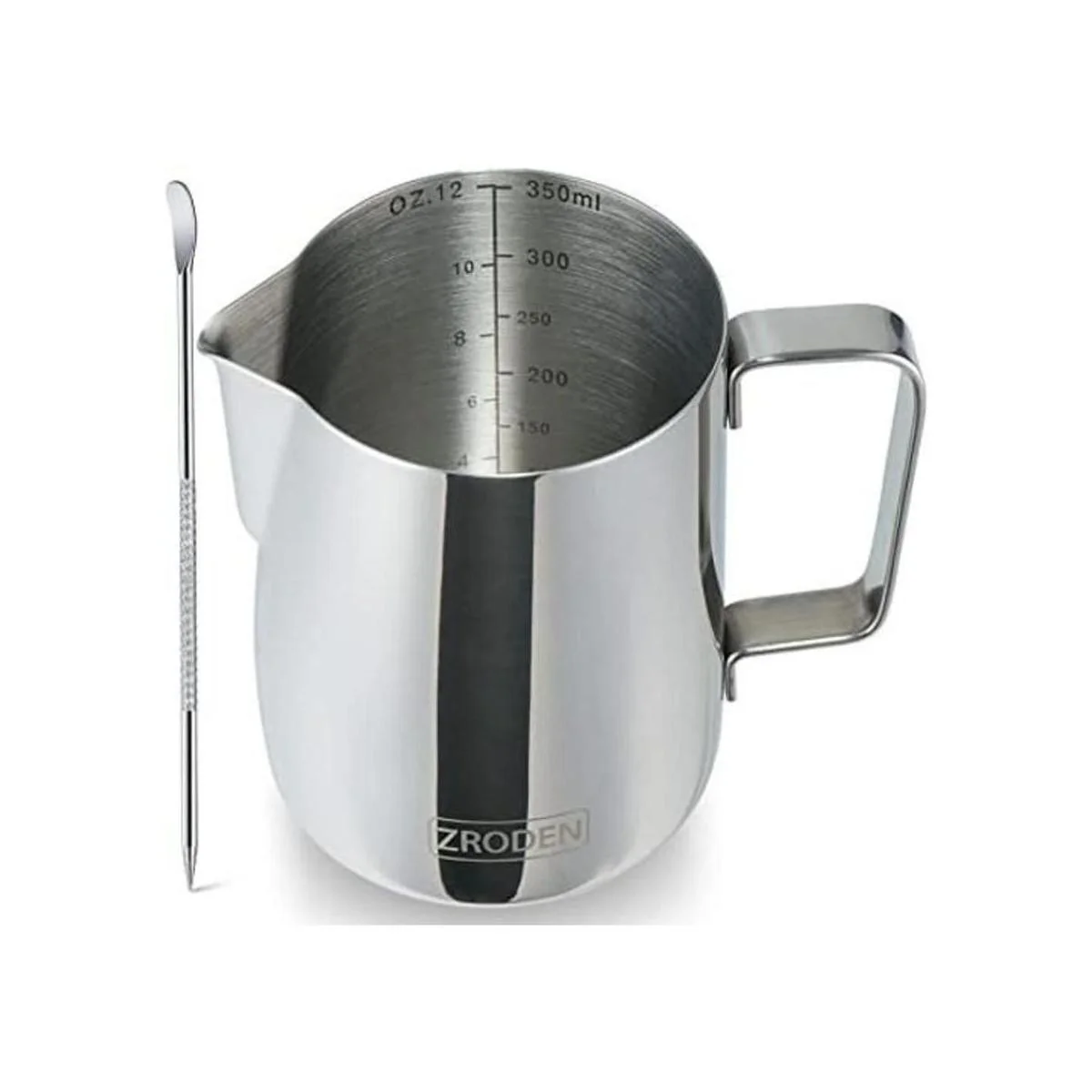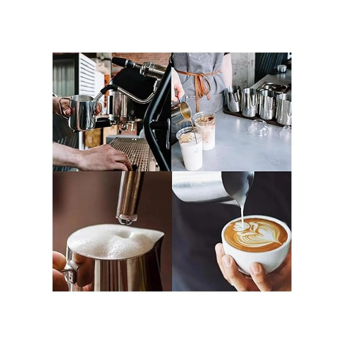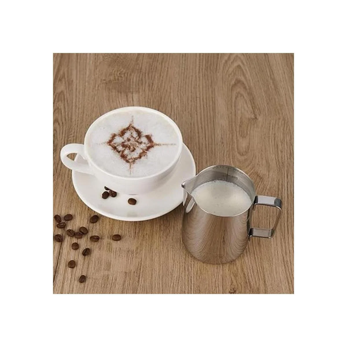 Calidad del material Las jarras de leche y el bolígrafo de arte de café están hechos de acero inoxidable 304 con acabado cromado. Resistente al óxido, a las manchas, al calor, irrompible por el uso diario. Soporta hasta muchos años de uso.