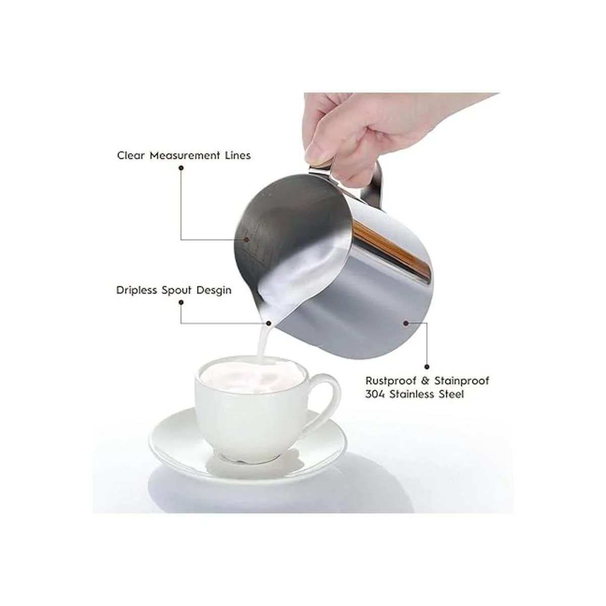 Pluma de arte con leche para jarras La jarra espumadora de leche se puede utilizar de diferentes maneras: espuma o leche al vapor para lattes; medir líquidos; servir leche o crema. Un bolígrafo de arte con leche que puede dar forma a tipos de hermosos patrones de café. Perfecto para hacer espuma o vapor leche para espresso, capuchino o chocolate caliente. Sé tu propio barista en casa y oficina.