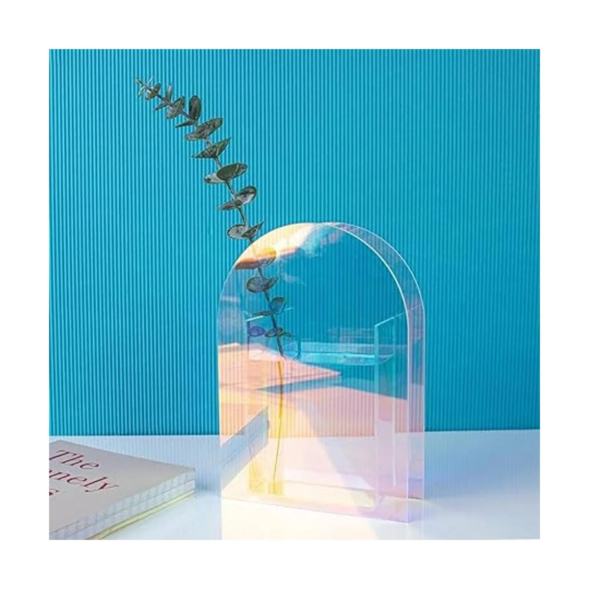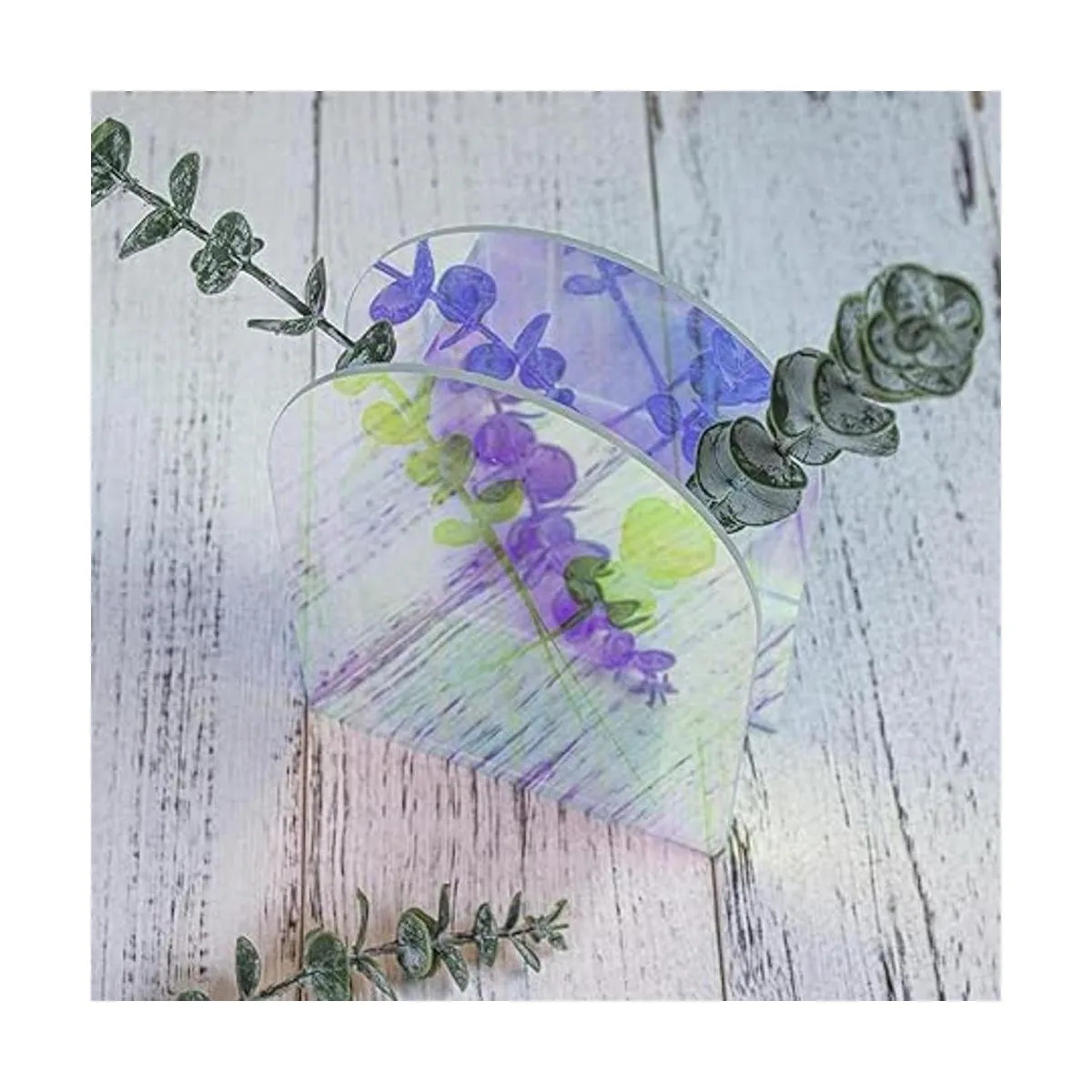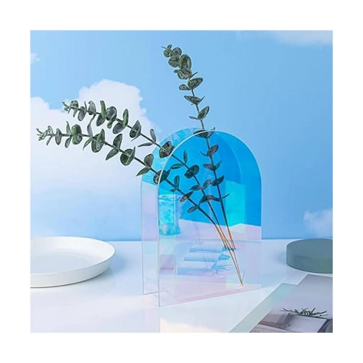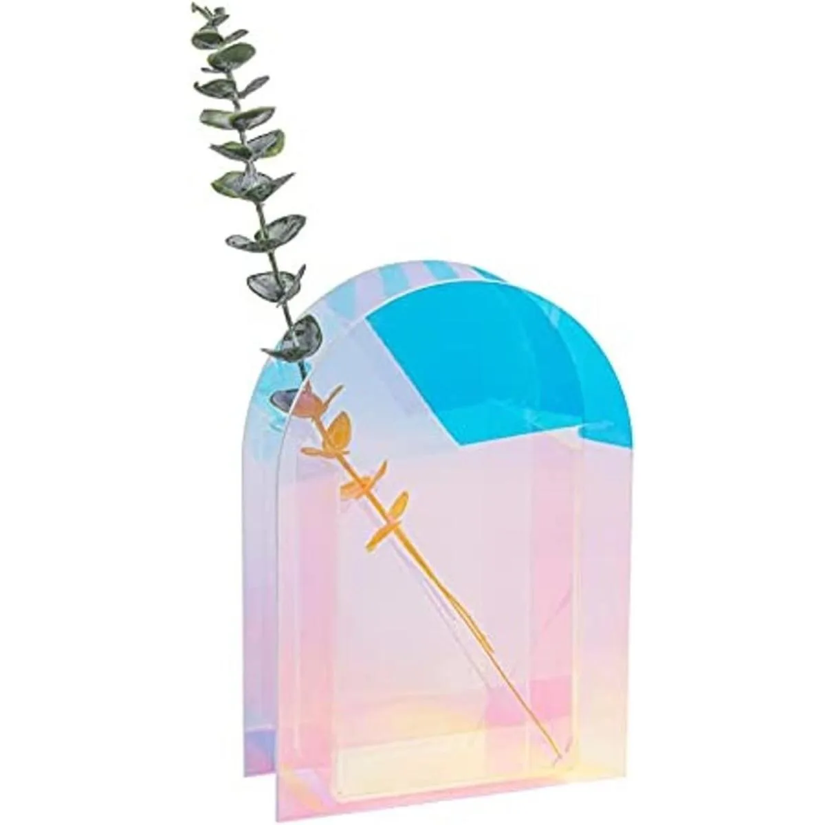 Material: este jarrón minimalista está hecho de acrílico transparente iridiscente de alta calidad, dos hojas artificiales de eucalipto hechas de plástico PVC y alambre de hierro.