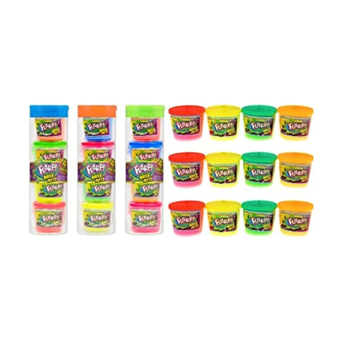 12 mini flarp en 3 tubos de colores surtidos. Divertida masilla que hace ruido en muchos recipientes. 4 mini flarps en cada tubo.