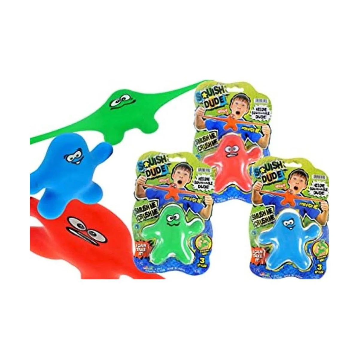 Paquetes de Estilos y colores variados de Monster Dude rojo, verde, azul. Pelota elástica. Exprimible, Delicius Soft hace que sea fácil y seguro para los niños. Se estira como la clásica figura de acción de juguete Armstrong Pull o el famoso plátano elástico.