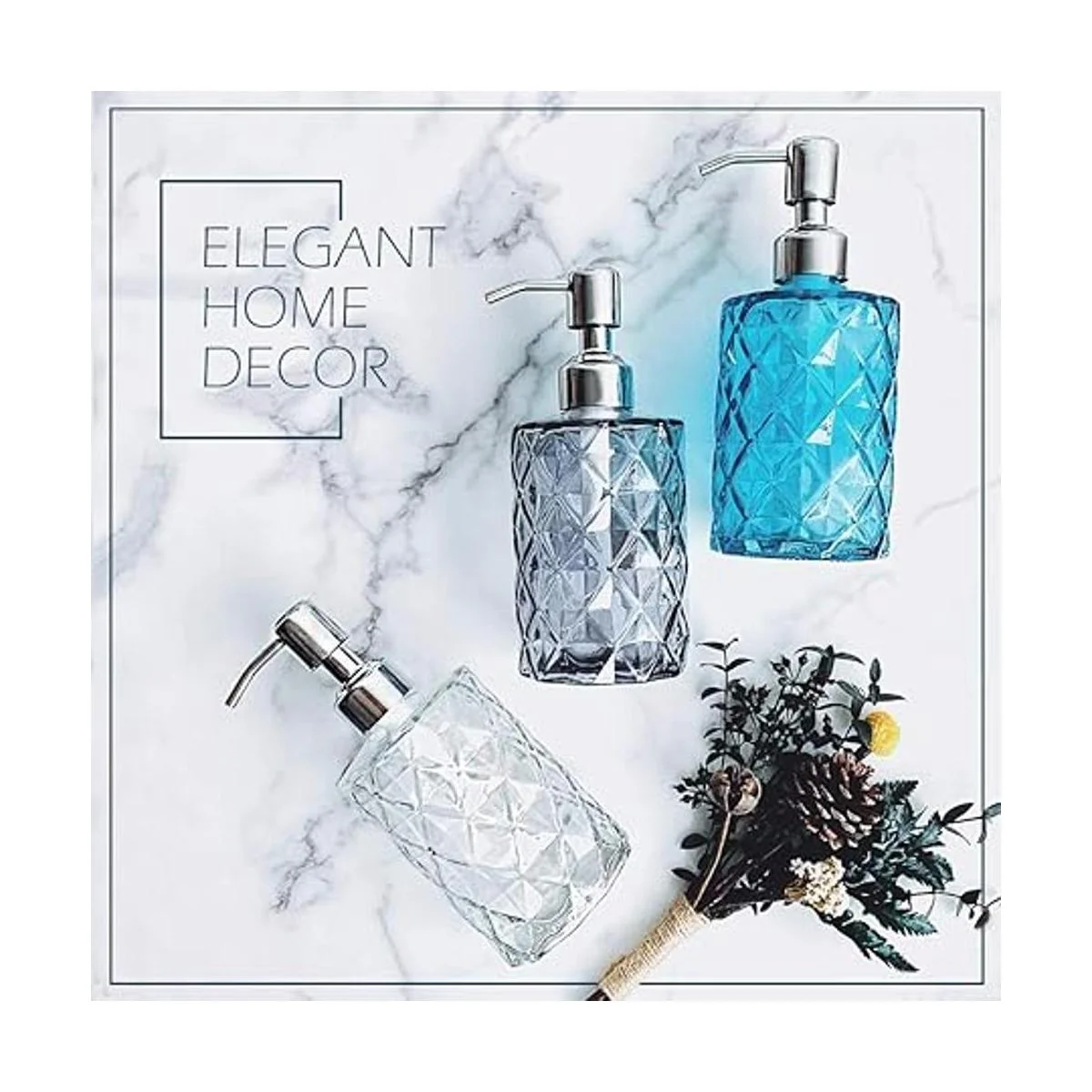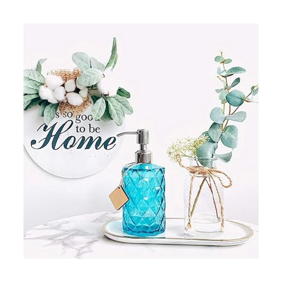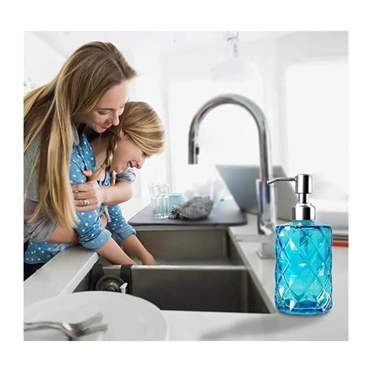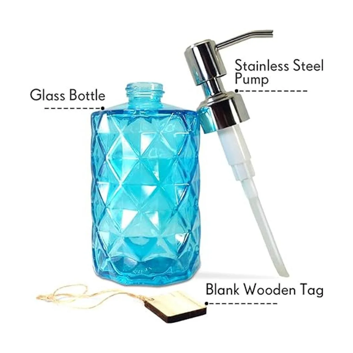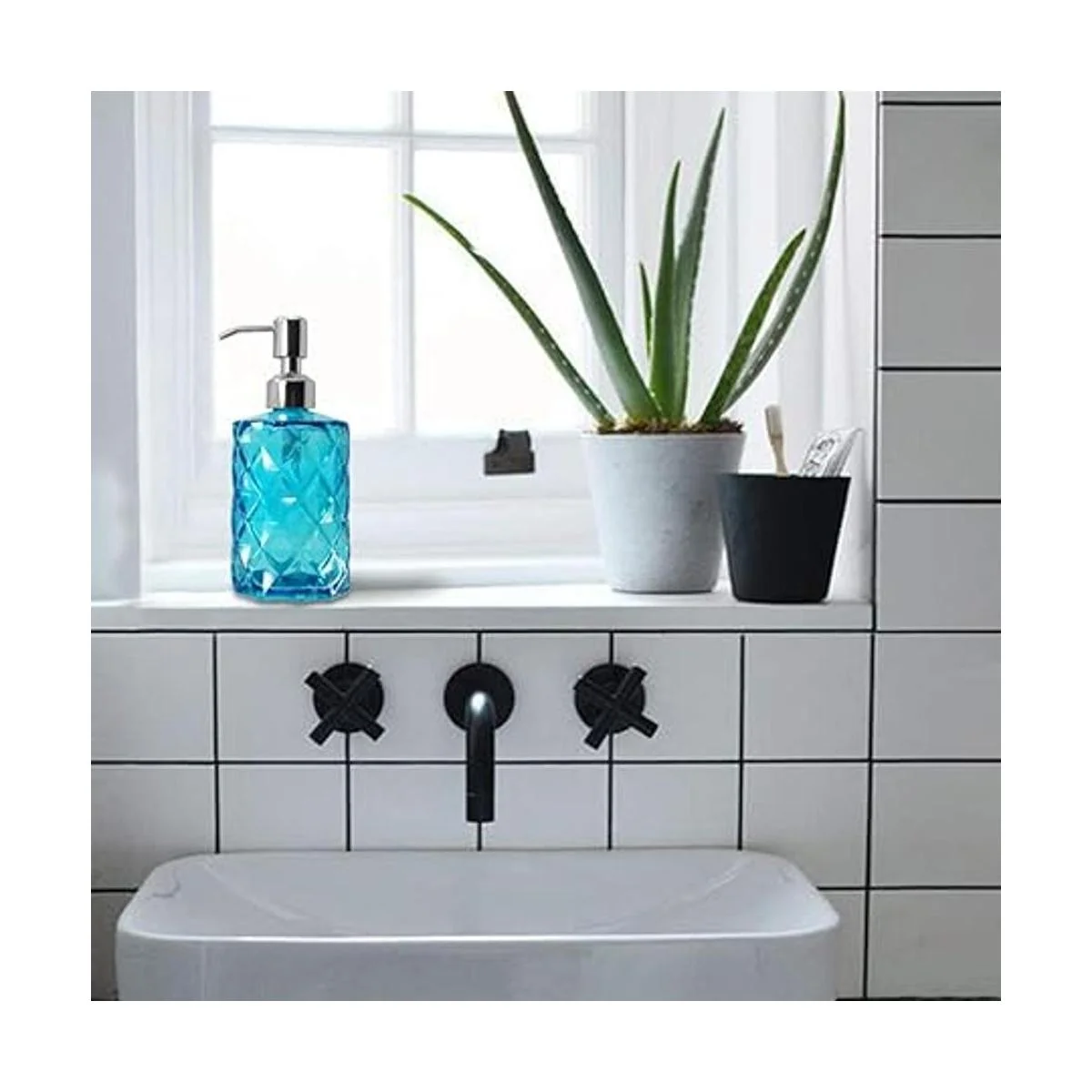 Elegante dispensador de jabón de vidrio azul con patrón geométrico, ideal para jabón, loción, jabón de manos, jabón de platos, etc.