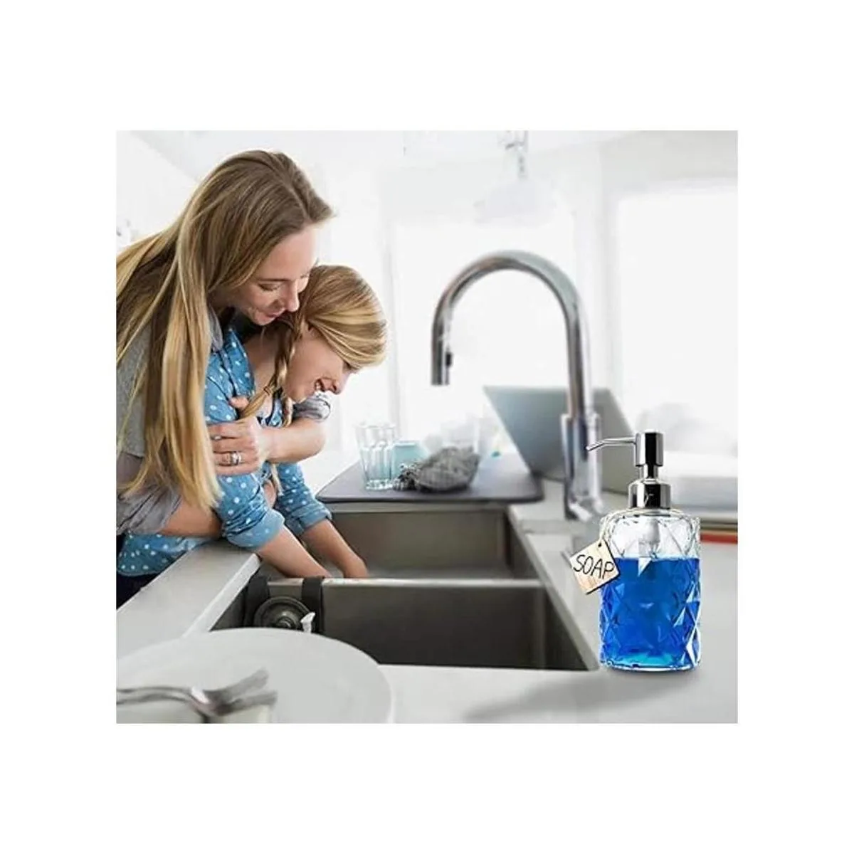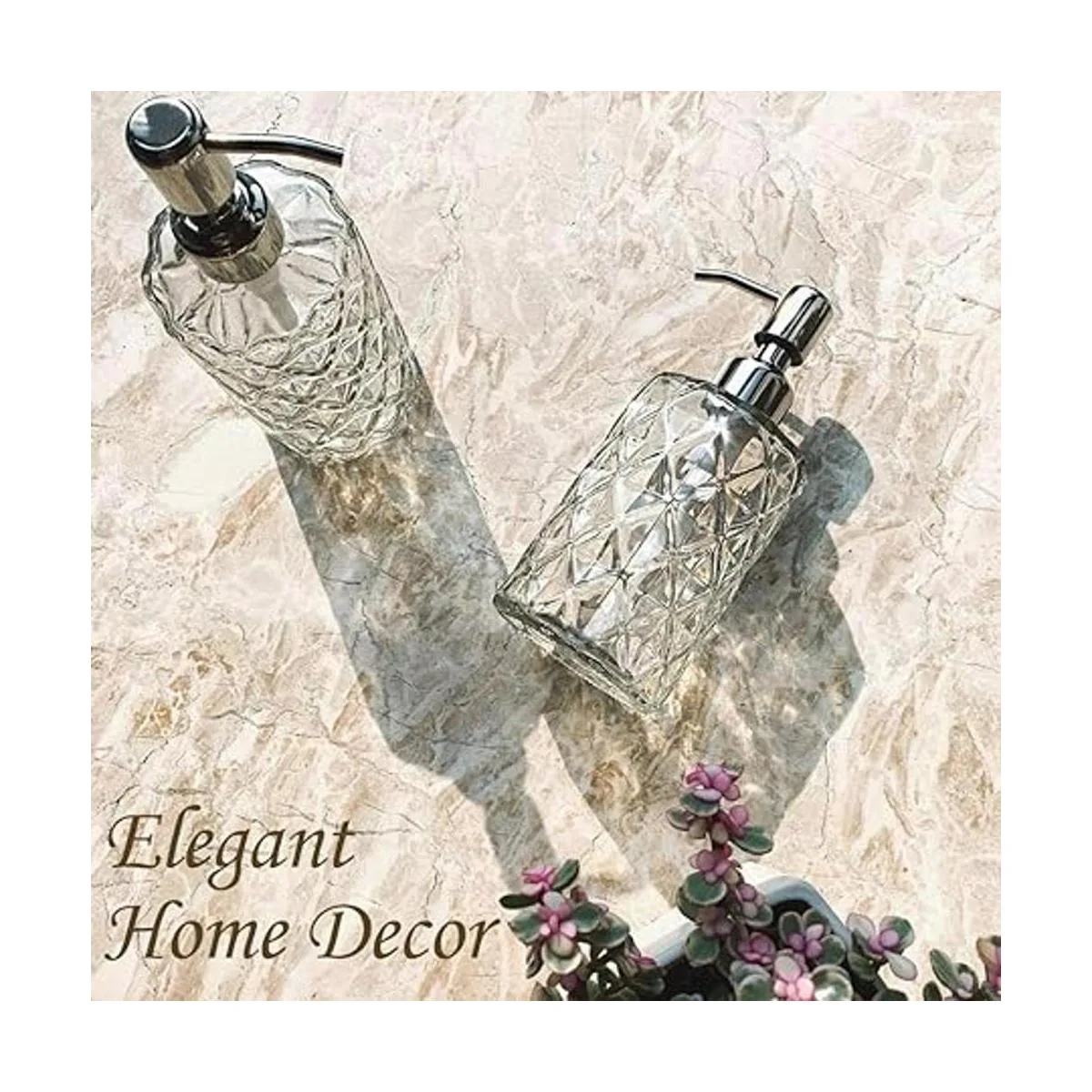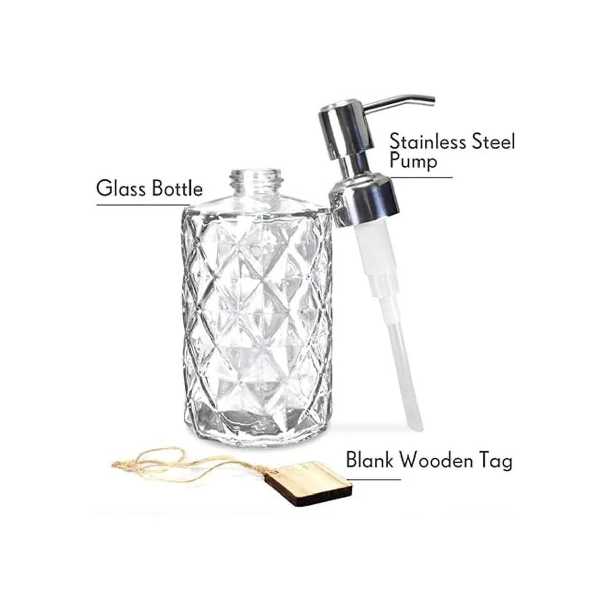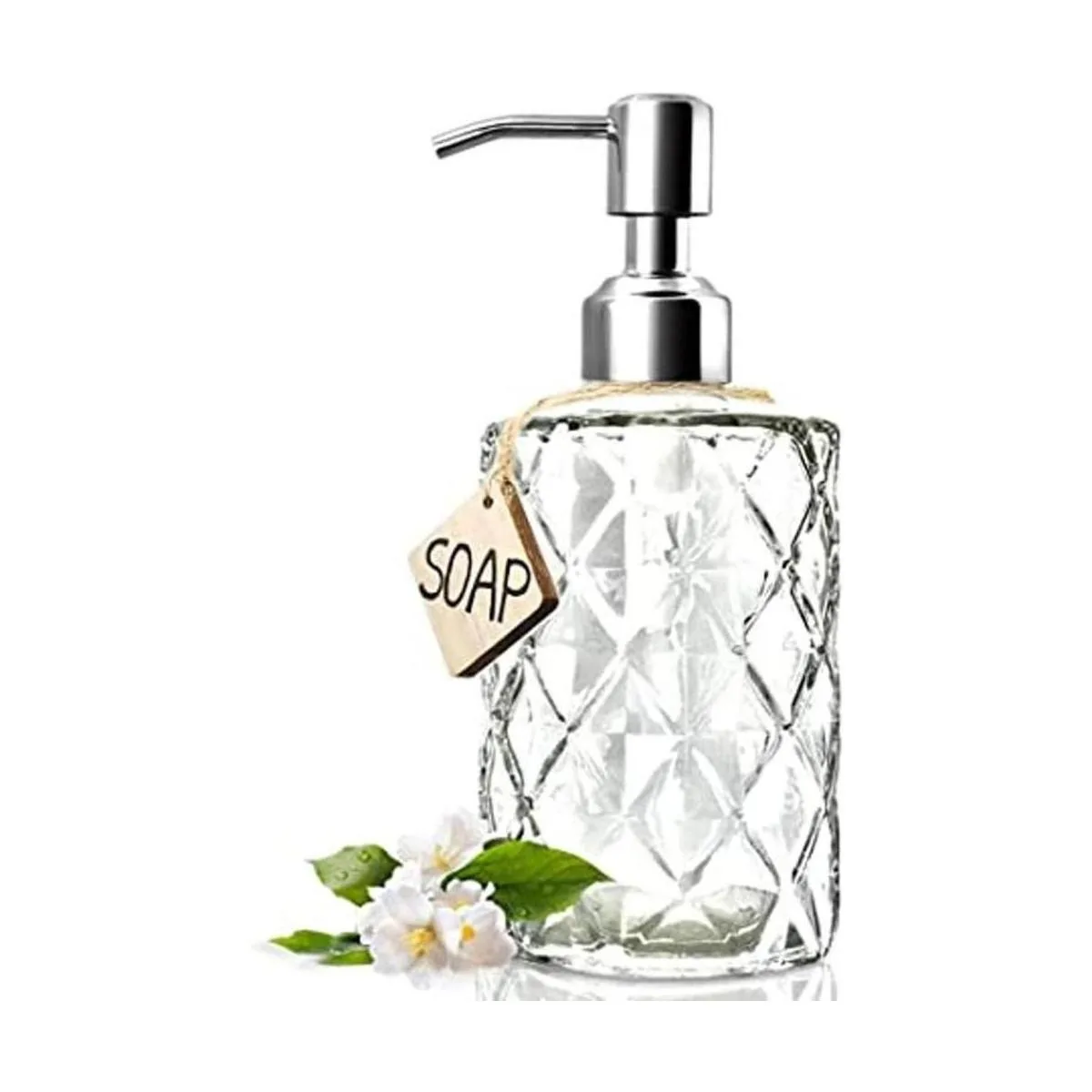 JASAI Diamond Design Dispensador de jabón de vidrio de 12 onzas, dispensador de jabón de cocina con bomba de acero inoxidable 304 a prueba de óxido, dispensador de jabón de baño para jabón de manos, jabón, loción transparente