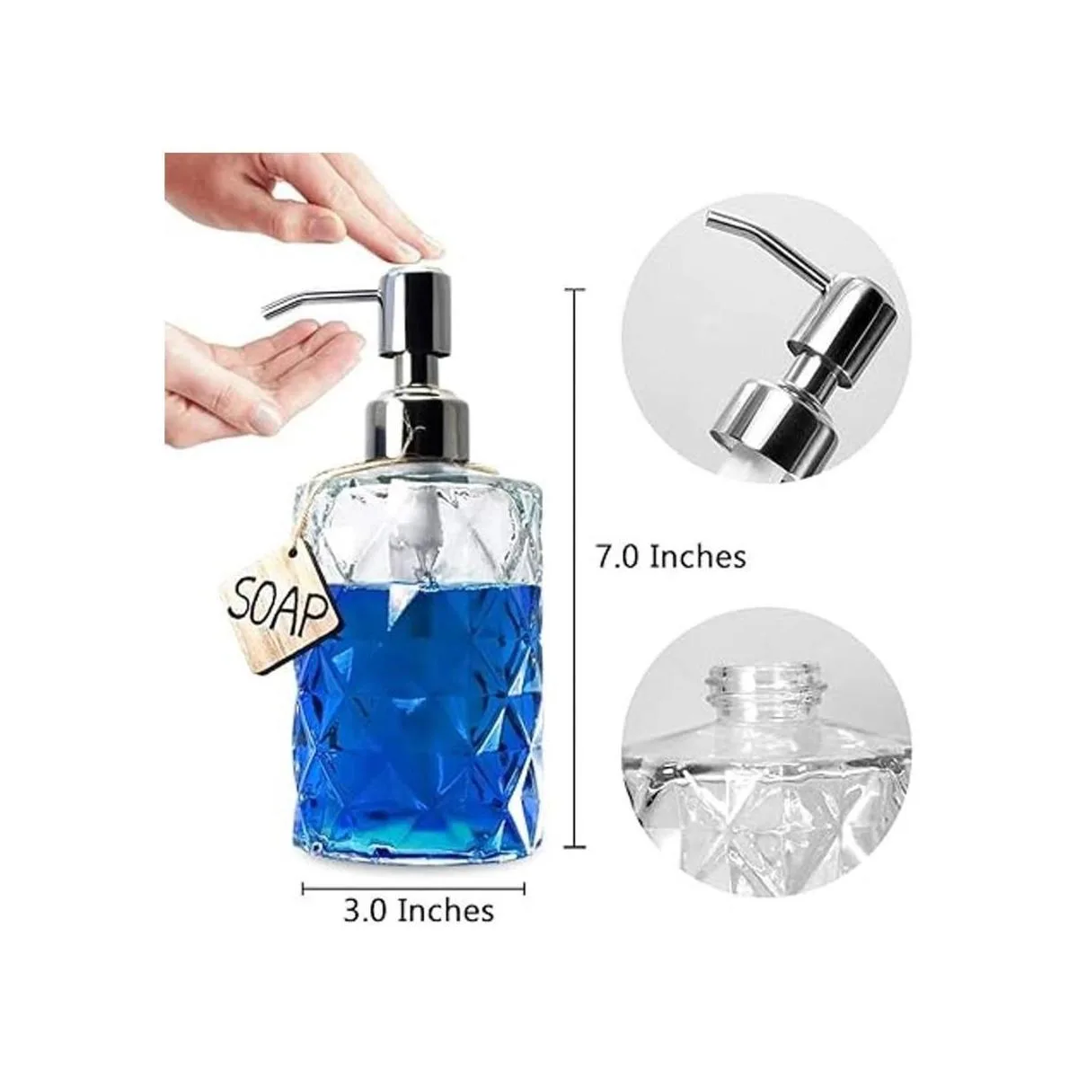 Dispensador de jabón de vidrio que mide 7 pulgadas de altura, 3 pulgadas de diámetro. Cada bomba de jabón tiene capacidad para 12 onzas de líquido.