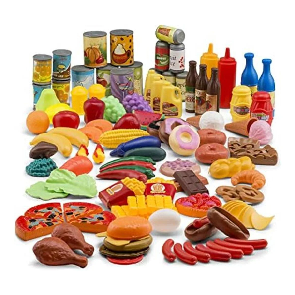 122 piezas. Desde frutas y verduras, pretender alimentos carne, pescado, huevos, leche, zumo, bebidas, sándwiches, pizza, hamburguesa, fritos franceses para jugar comida panadería, pan, pastel, donuts, galletas, helado, este juego proporciona todos los grupos de alimentos básicos para que los pequeños se preparen y sirven. Con 122 piezas, tus hijos se sentirán como si tuvieran su propia pequeña tienda de alimentos en casa para entretenerlos durante horas al final.