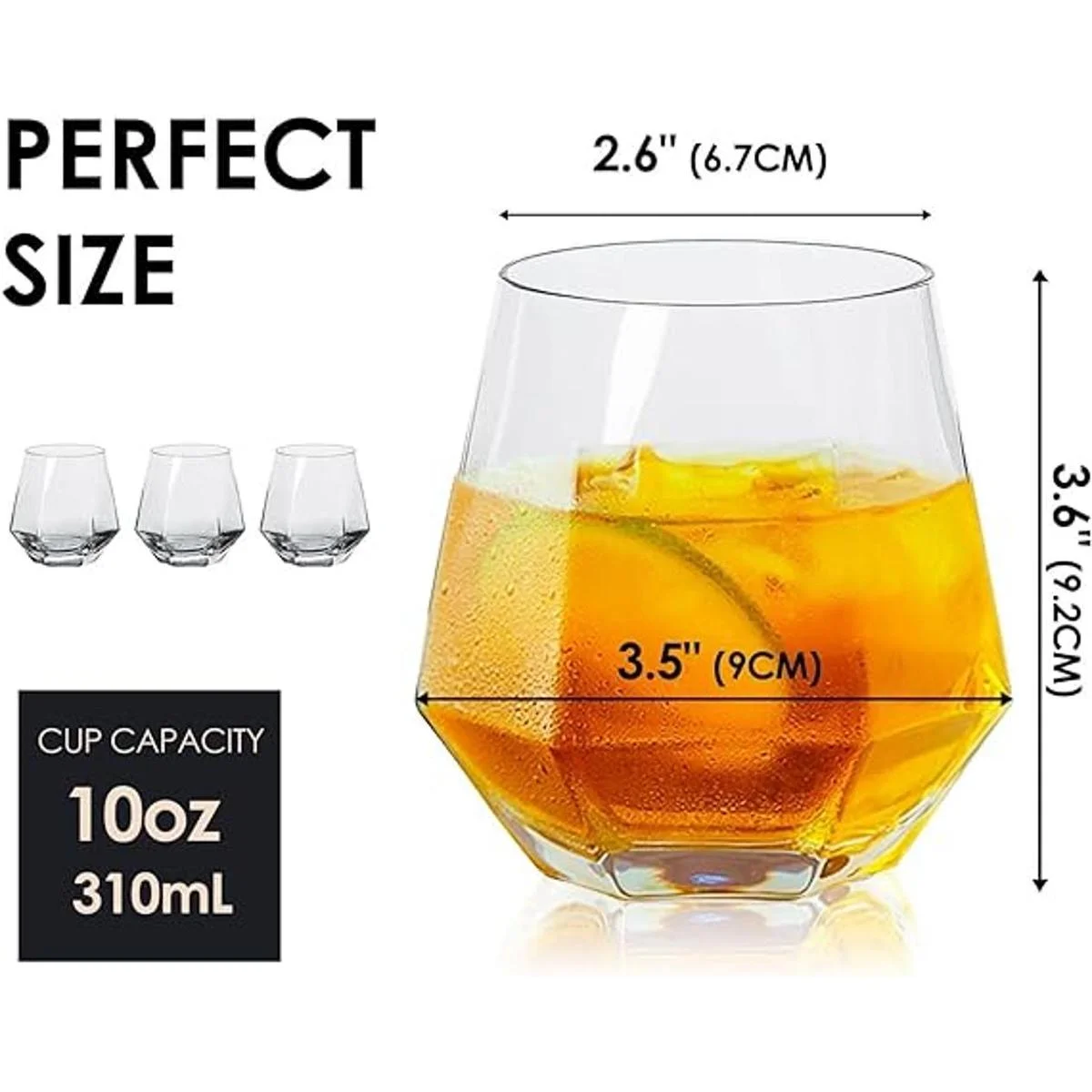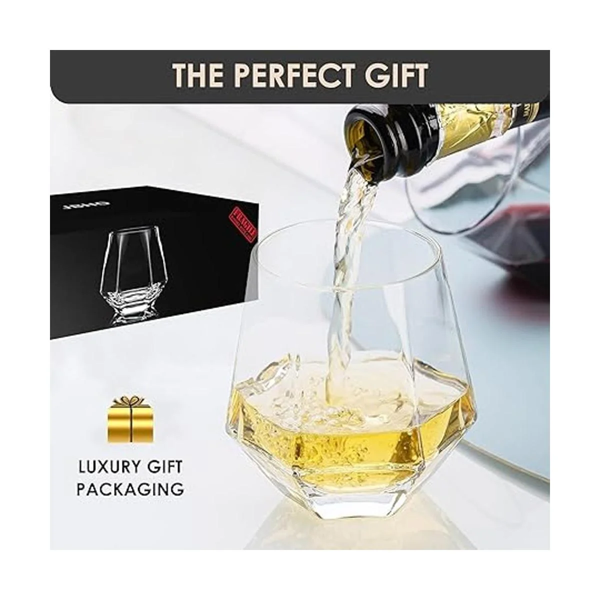 Diseño único y calidad profesional: forma elegante e interesante, una impresionante pantalla visual para ti y tus amigos. Inspirado en los diamantes, la forma única hace que tu bebida sea transpirable. Hecho de vidrio transparente, sin plomo, de alta calidad, resistente y duradero, apto para lavavajillas, adecuado para refrigeradores y congeladores. Para uso diario y fácil de limpiar