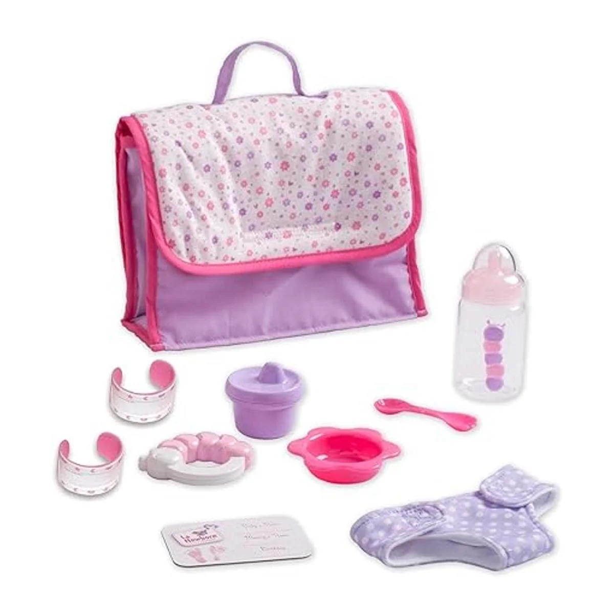Juego de regalo de 10 piezas: incluye bolsa cambiadora de pañales que se pliega en una alfombrilla, dos pañales, tapa a juego, taza para sorbos, plato, cuchara/tenedor, sonajero, botella de limpieza de simulación, pulsera de hospital y certificado de nacimiento.