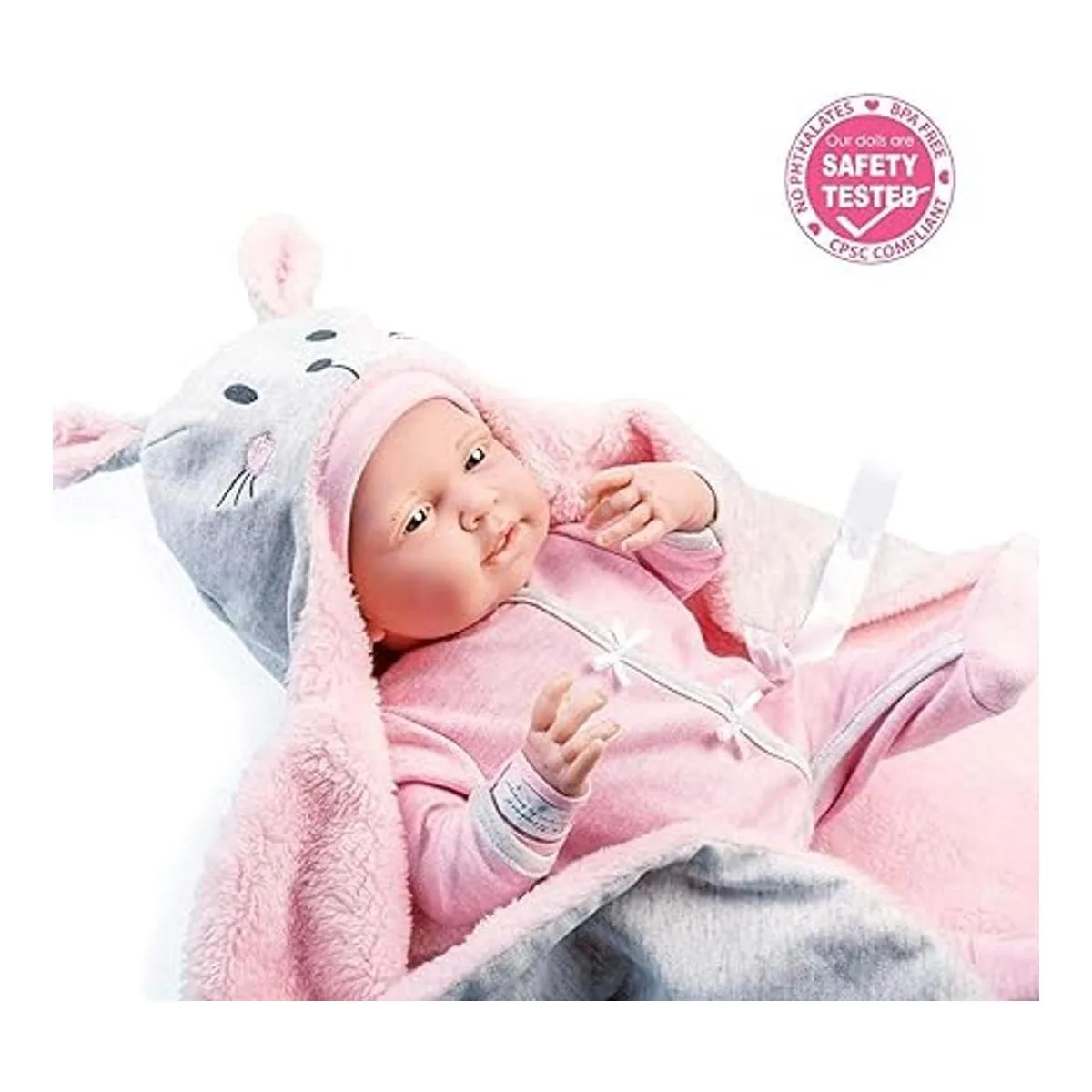 Set de regalo de 15.5 in con temática de conejos y accesorios // Perfecto para disfrazarse divertido, incluye muñeca de cuerpo suave, traje y sombrero, manta con capucha, chupete, sonajero, botella, pulsera de hospital y certificado de nacimiento para que lo personalices