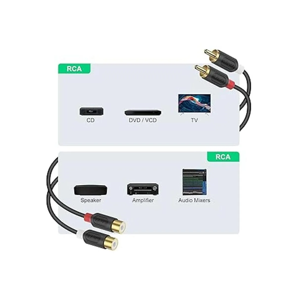 Conector perfecto: conexión 2RCA macho a 2RCA hembra; ideal para entretenimiento en el hogar y sistema de alta fidelidad como receptor estéreo, altavoz, amplificador y otros dispositivos habilitados para RCA
