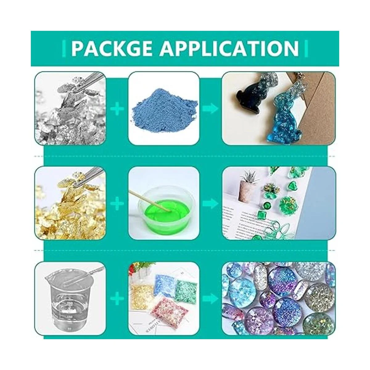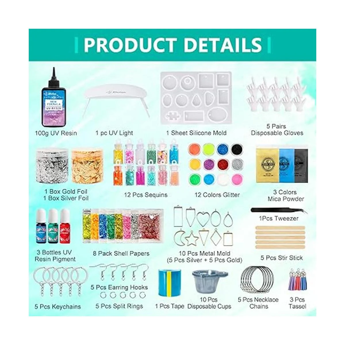 Paquete de gran valor Resina ecológica UV de 3.53 oz luz UV cable tipo C, 1 molde de silicona, 1 caja de lámina dorada, 1 caja de lámina plateada, 12 lentejuelas, 12 colores de purpurina, 3 colores de polvo de mica, 3 botellas de pigmento de resina UV, 8 paquetes de papeles de concha, 10 moldes de metal 5 dorados 5 plateadas, 1 plateadas, 1 unidades Pinzas 5 Palitos de agitación, 5 llaveros, 5 ganchos para aretes, 5 anillos divididos, 1 cinta, 5 pares de guantes, 10 tazas desechables, 5 cadenas de collar, 3 borlas; kit perfecto JDiction para ayudarte a empezar rápidamente.