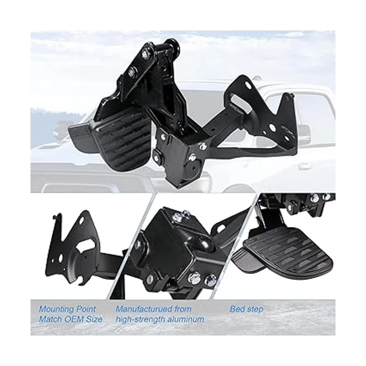 Cuenta con un brazo articulado que se baja hacia abajo para un fácil acceso a la caja del camión y se retrae de nuevo a la posición almacenada con un suave empuje para dar un aspecto fuera del camino dentro del parachoques