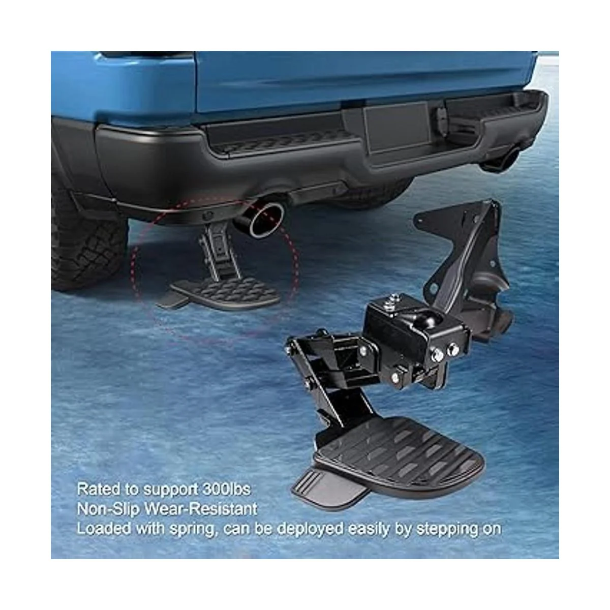 Este escalón abatible fácil de usar se monta en el marco del vehículo y se almacena debajo del parachoques trasero cuando no se utiliza, cargado con resorte, se puede desplegar fácilmente pisando, por lo que funciona incluso con un portón trasero abierto o cuando remolques