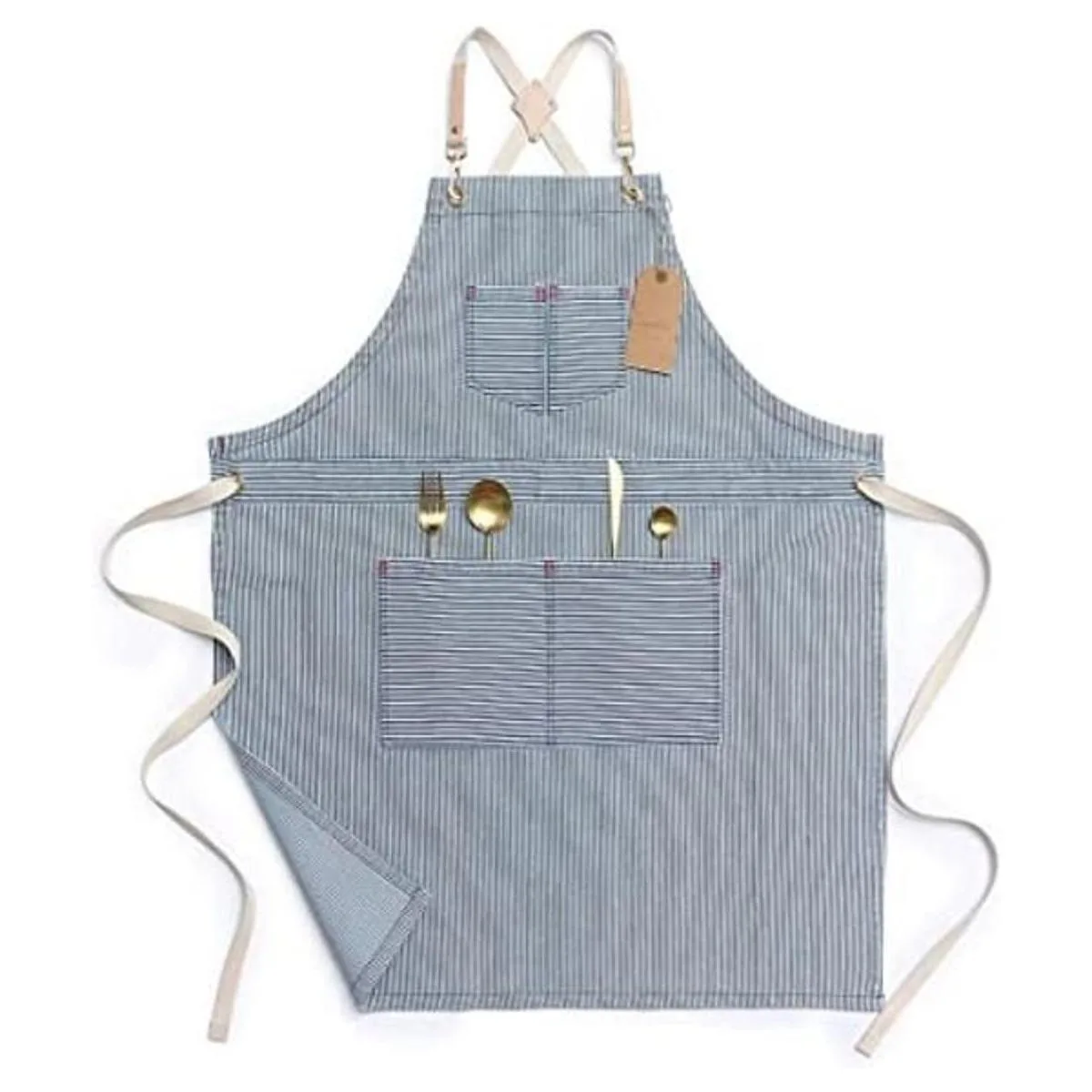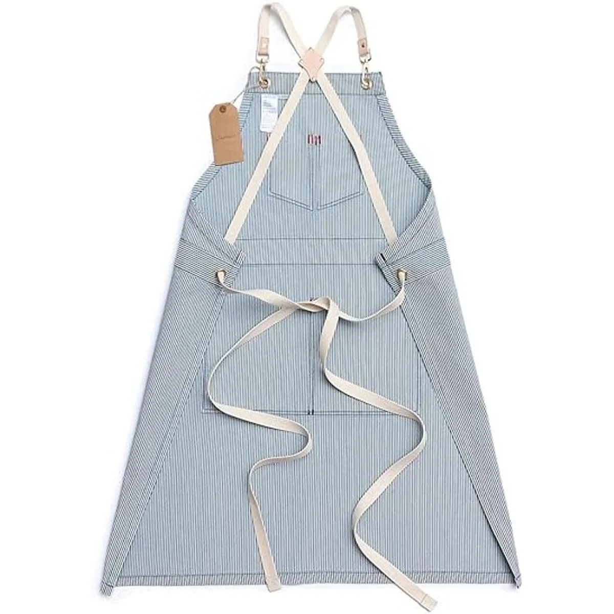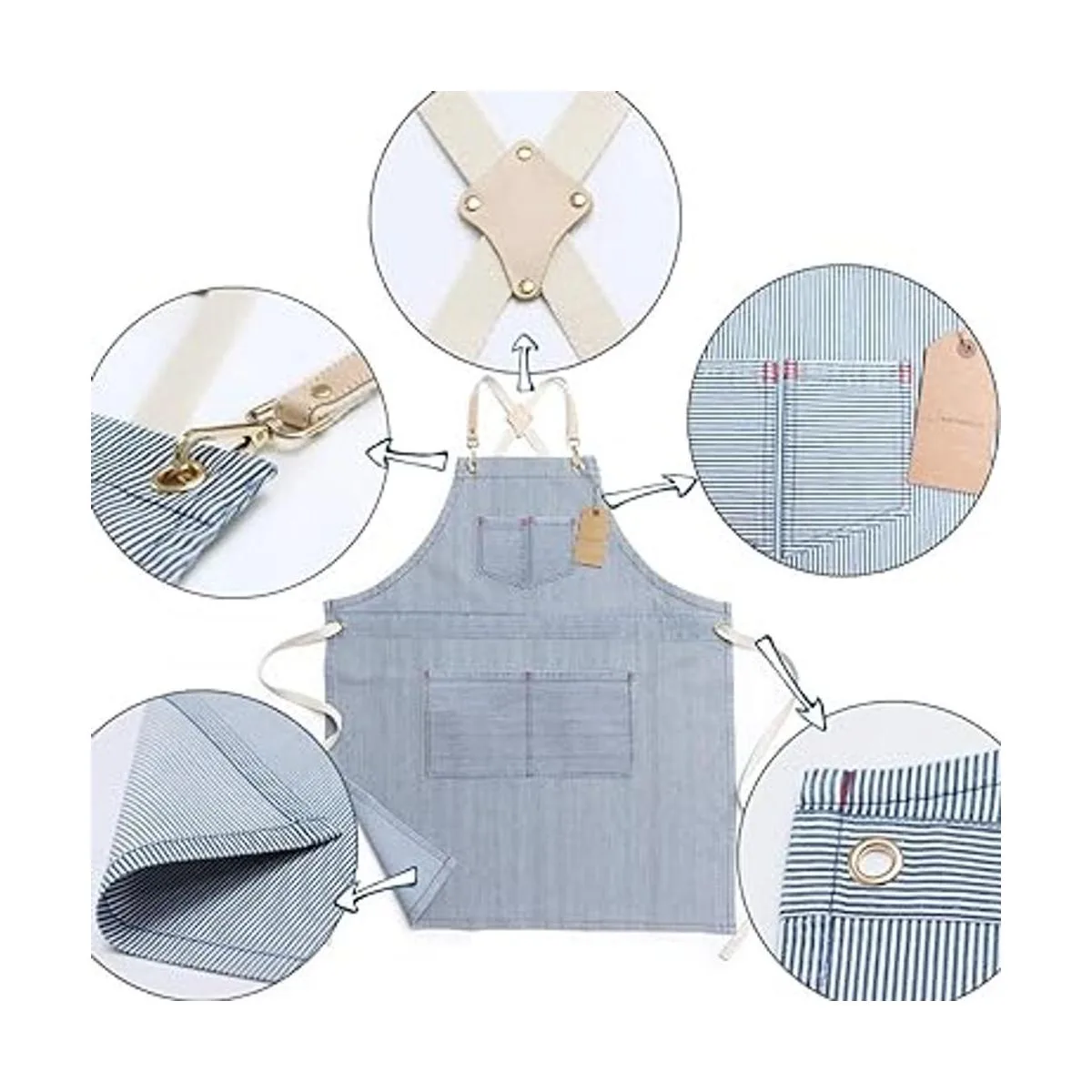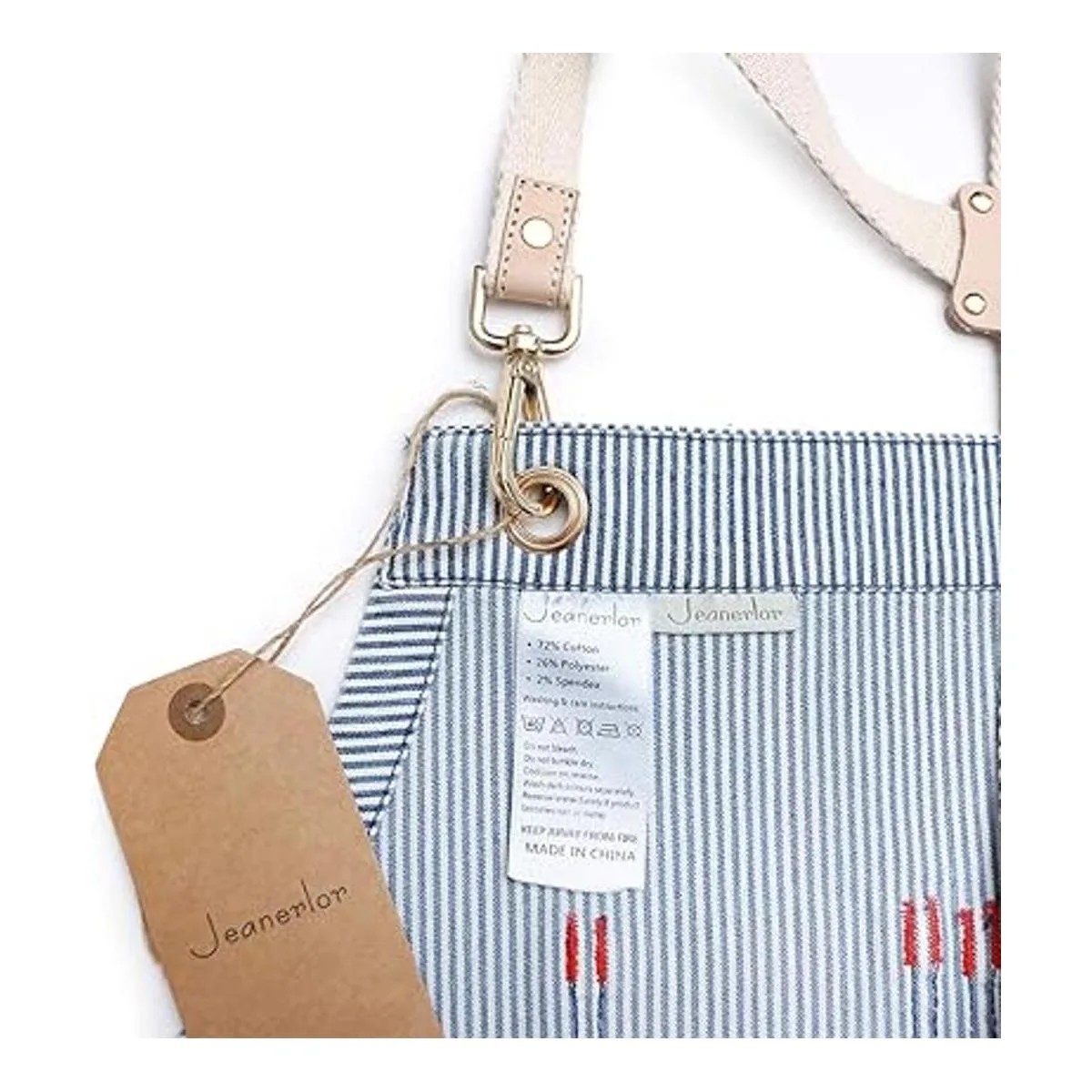 Jeanerlor Delantales de mezclilla a rayas azules para mujeres y hombres Jean Cross Back Delantal ajustable cuello unisex con 4 bolsillos para barista, chef, barbero, pintor y jardinero, ajustable M a XXL
