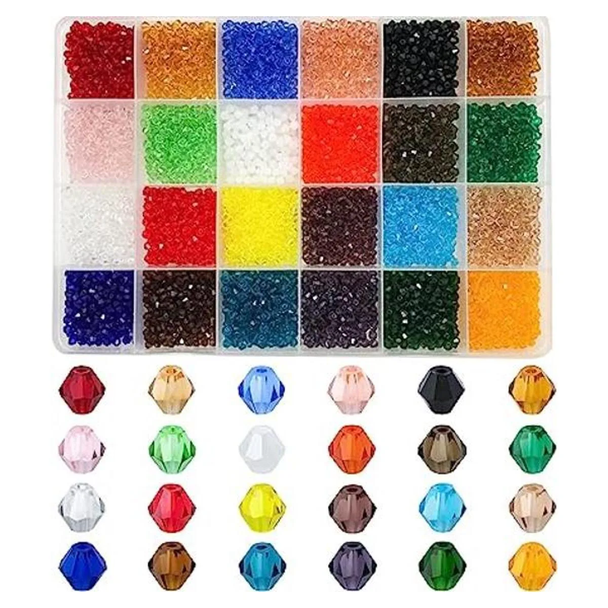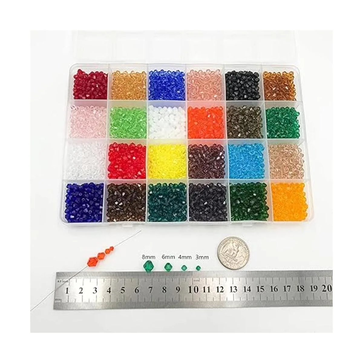 Cantidad: 4800 cuentas de cristal bicono, 24 colores con cada color 200 unidades. Cuentas multicolor empaquetadas individualmente en una caja de 24 compartimentos para una fácil portabilidad.
