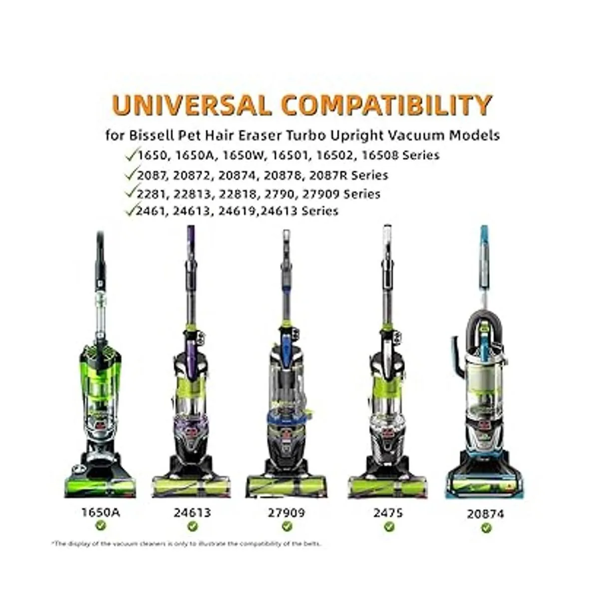 Amplia compatibilidad: estos cinturones se ajustan perfectamente a la aspiradora vertical Bissell Pet Hair Eraser 1650, 16501, 16502, 16508, 1650A, 1650C, 1650P, 1650R, 1650W, 2087, 20871, 20872, 20874, 20874. 0878. 2087R, 2087Q; borrador de pelo de mascotas Turbo 2475, 2475N; borrador de pelo de mascotas Turbo Pro 22814,2281K; borrador de pelo de mascotas Turbo Plus 2281,22813,22818,2461,24619,24613; SurfaceSense Pet MultiS. aspiradora urface 28 17,28179,28172,3439 y goma de borrar pelo de mascotas Turbo Rewind 2790,2790W, 27902,27909.
