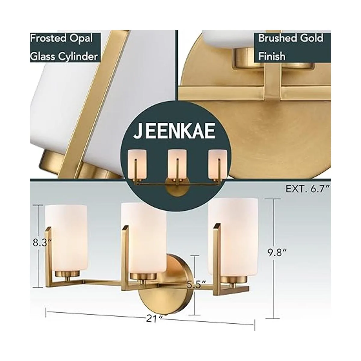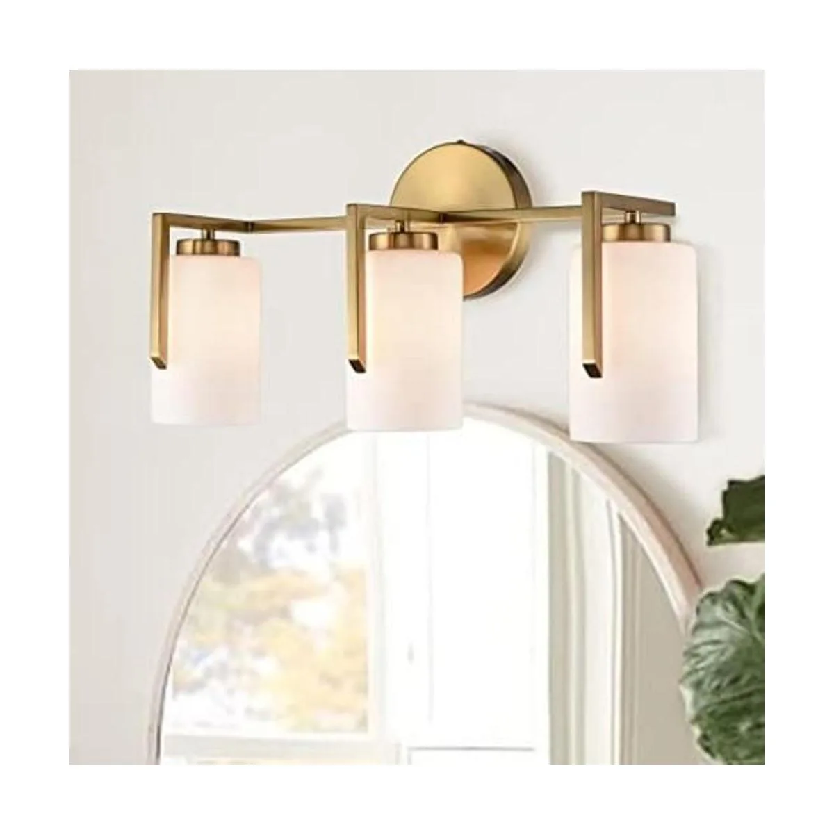 JEENKAE Modernas lámparas de baño doradas de granja sobre espejo cilíndrico de ópalo de cristal, 3 luces de tocador