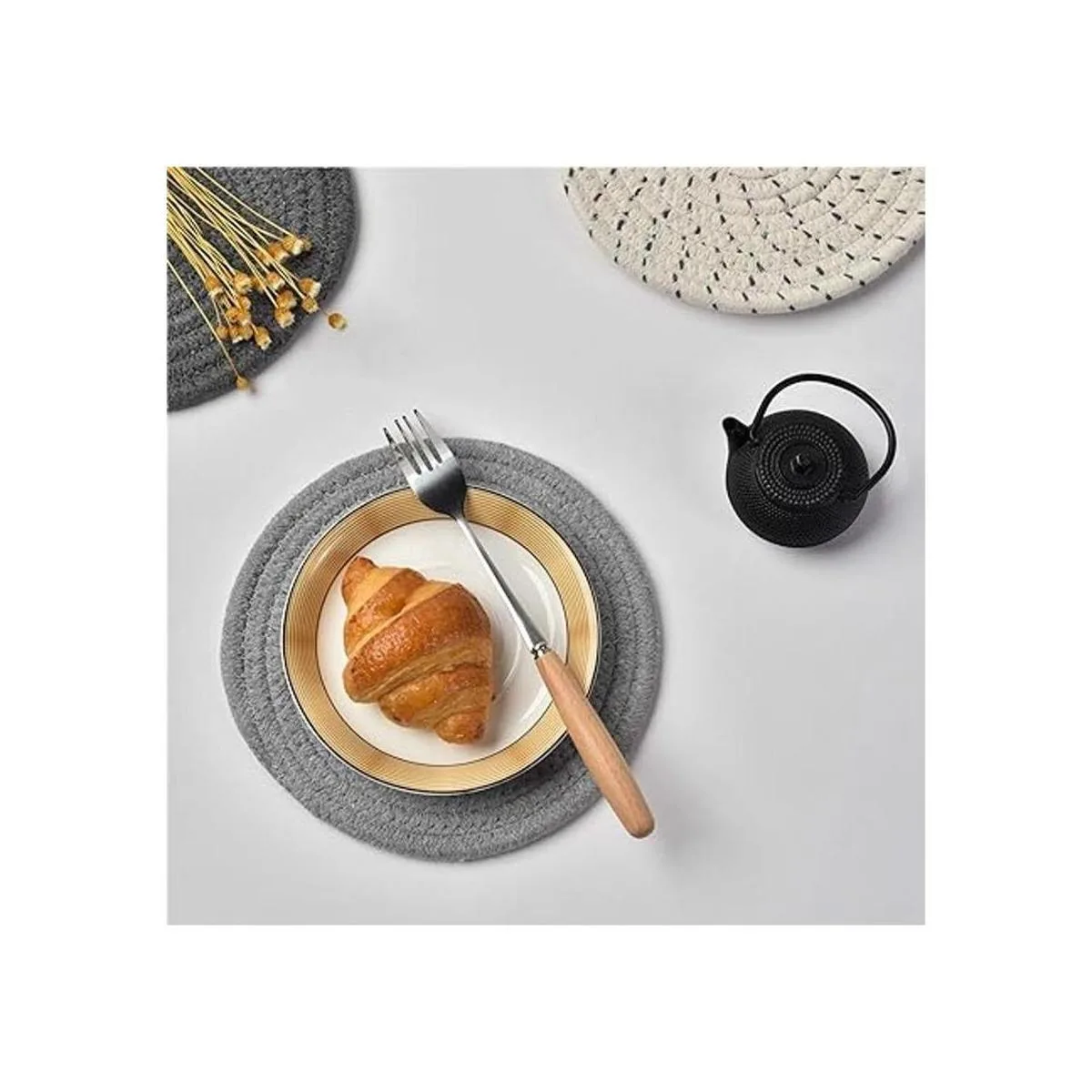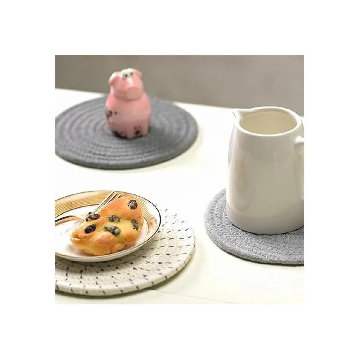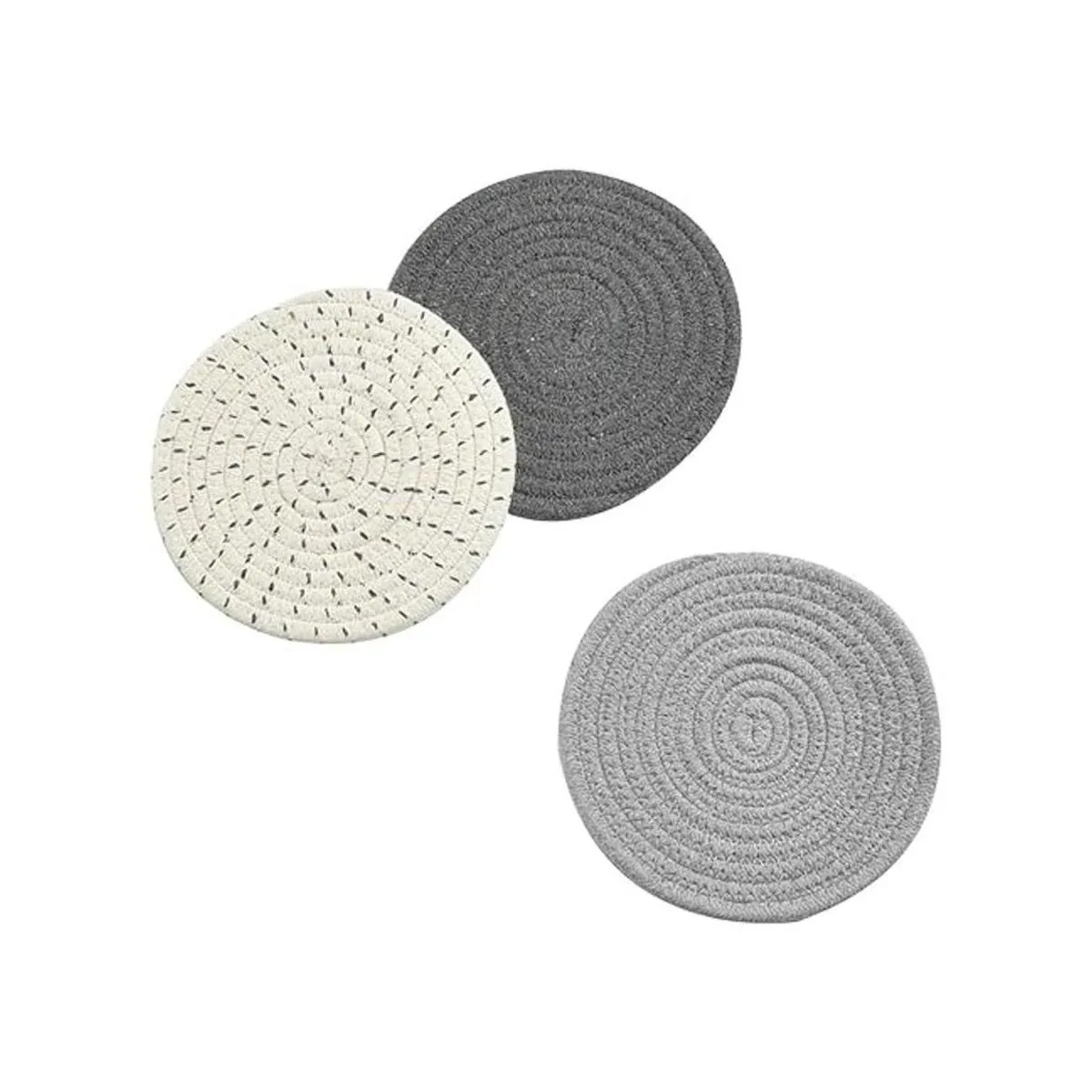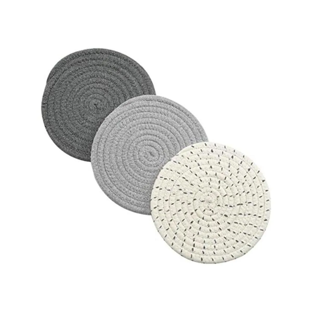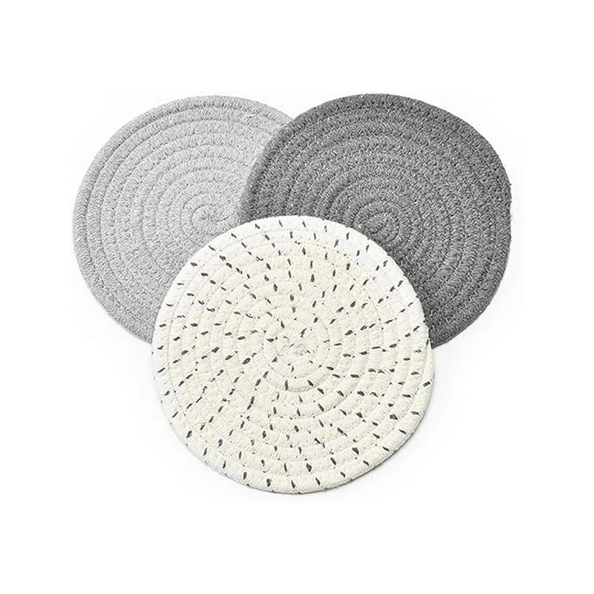 Jennice House Juego de 3 portavasos de tela de algodón 100 puro, portavasos elegantes, almohadillas para el calor, esterillas para el calor, apoya cucharas para cocinar y hornear con diámetro de 7 pulgadas, Gris