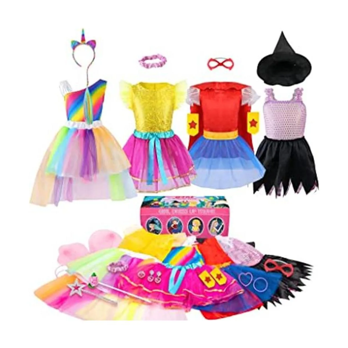 Jeowoqao Conjunto de disfraz de princesa para niñas, 24 piezas, juego de simulación, cuento de hadas, superniña, princesa, disfraz de unicornio arcoíris para niñas pequeñas de 3 a 5 años