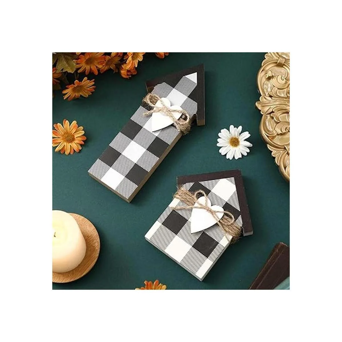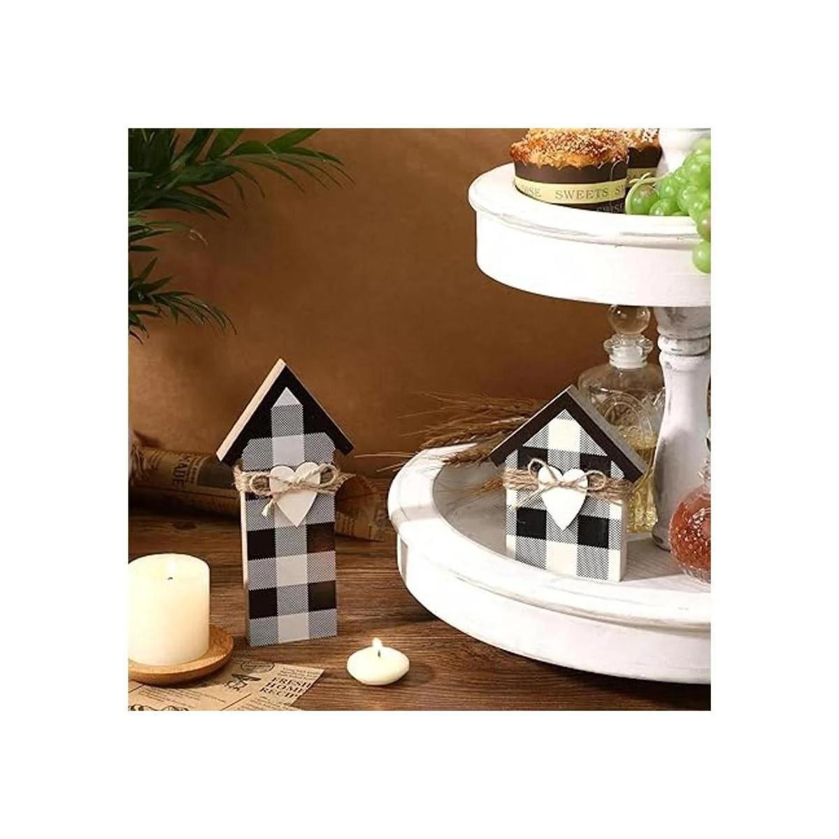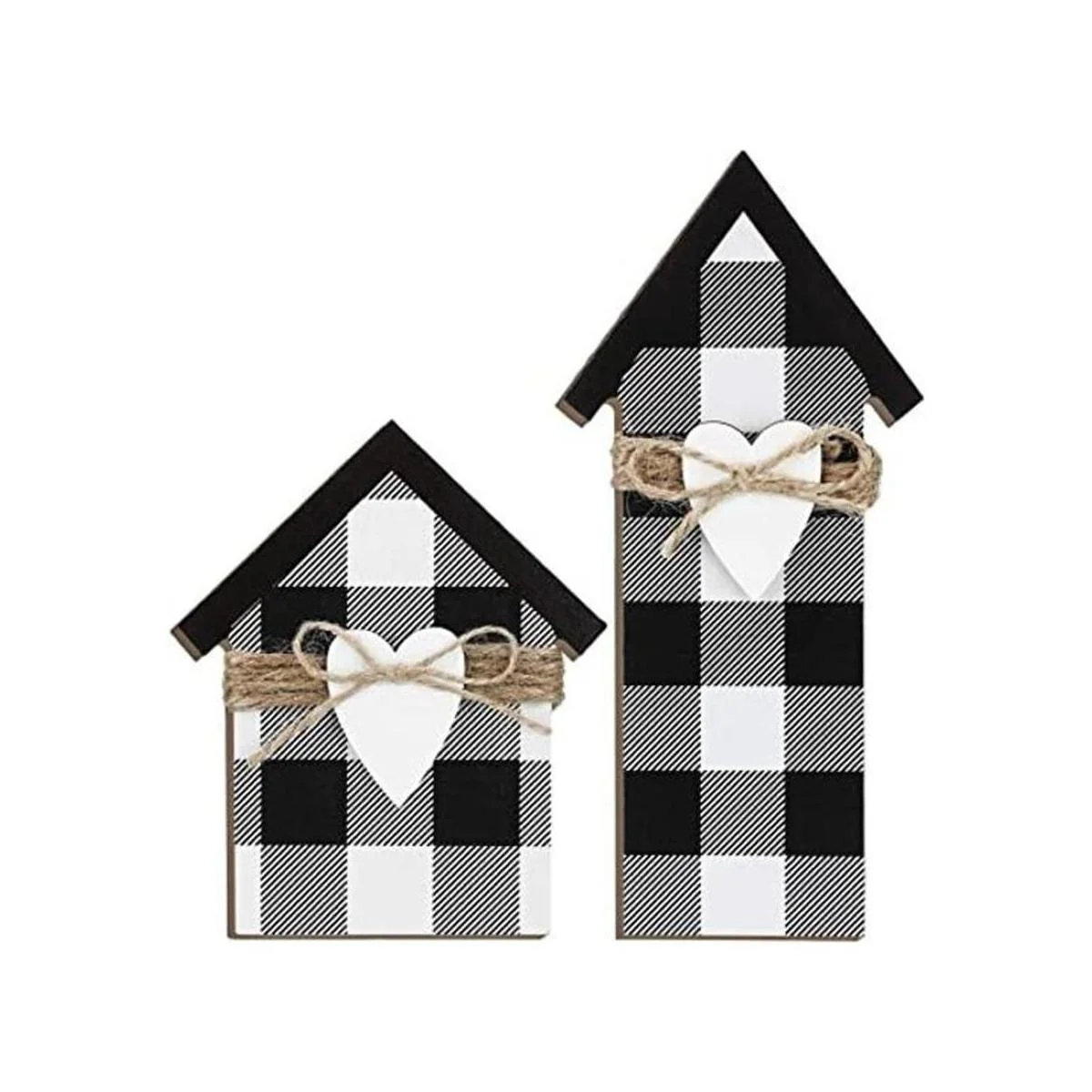 Jetec Letrero de madera con forma de casa de búfalo de 2 piezas, diseño a cuadros de búfalo de granja, decoración escalonada para Navidad, sala de estar, ventana, escritorio, oficina