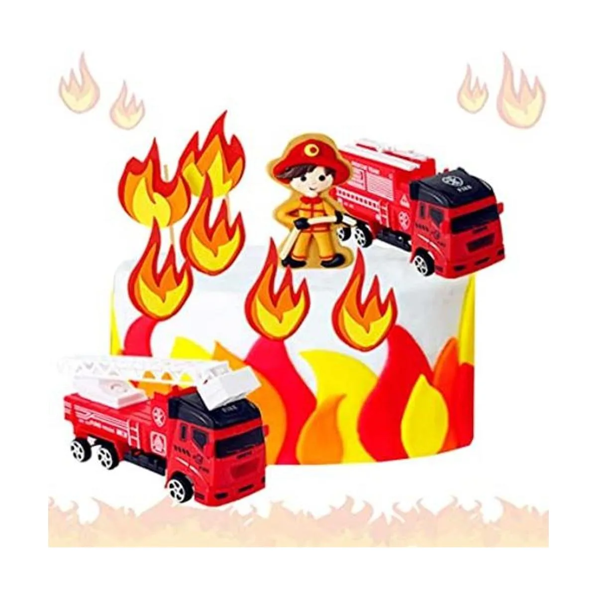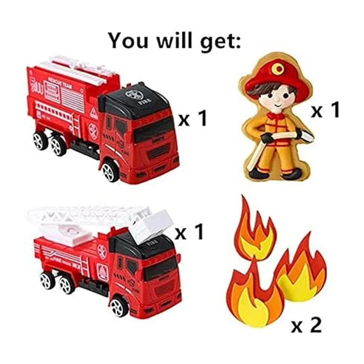 El paquete incluye: 2 juguetes de camión de bomberos, 1 bombero, 6 decoraciones de bomberos. Tamaño como se muestra en la imagen.