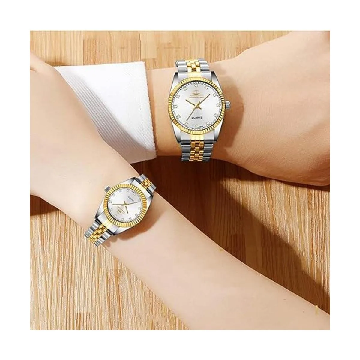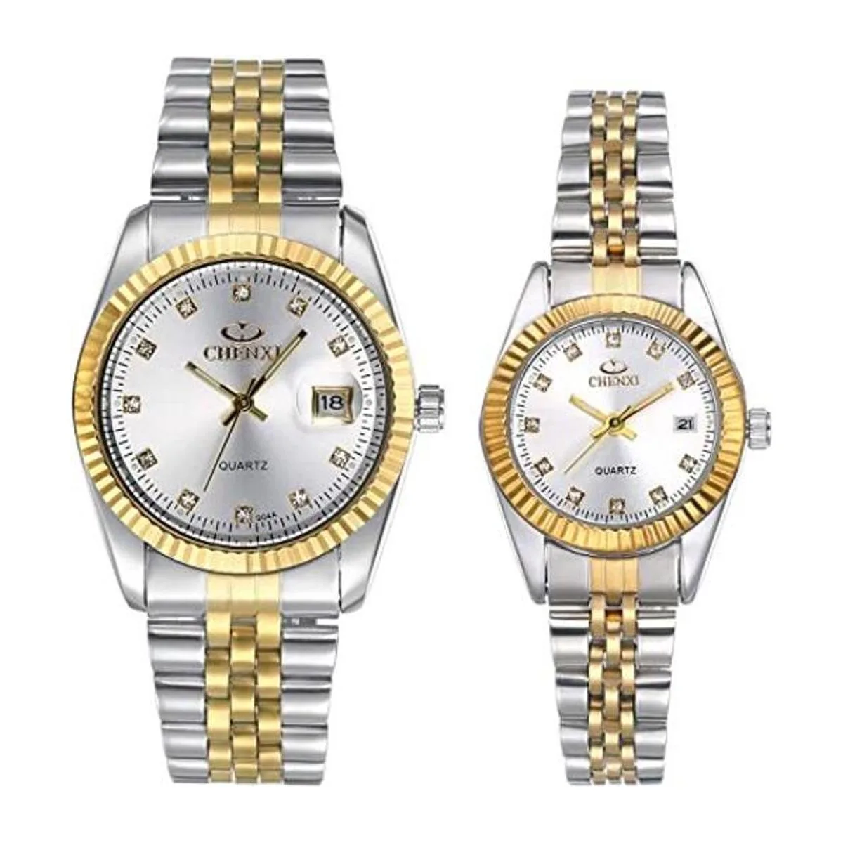 Lujoso y elegante: este par de relojes de pulsera clásicos y simples es moderno. El bisel dorado combina con la correa de acero en tono dorado y plateado. Un par de relojes CP adecuados para él y ella como regalo de relación a distancia. Relojes Forever Love. El reloj de vestir casual de negocios de moda revela tu temperamento elegante y gustos aristocráticos.