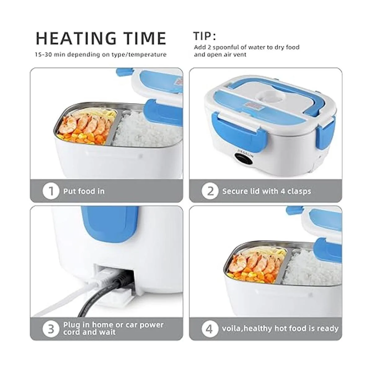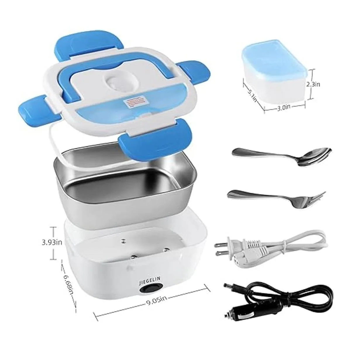 JIEGENLIN Fiambrera eléctrica 2 en 1, 12 V/24 V/110 V/220 V portátil para automóviles y hogares, tenedor de contenedor de acero inoxidable y cuchara y bolsa portátil (azul)