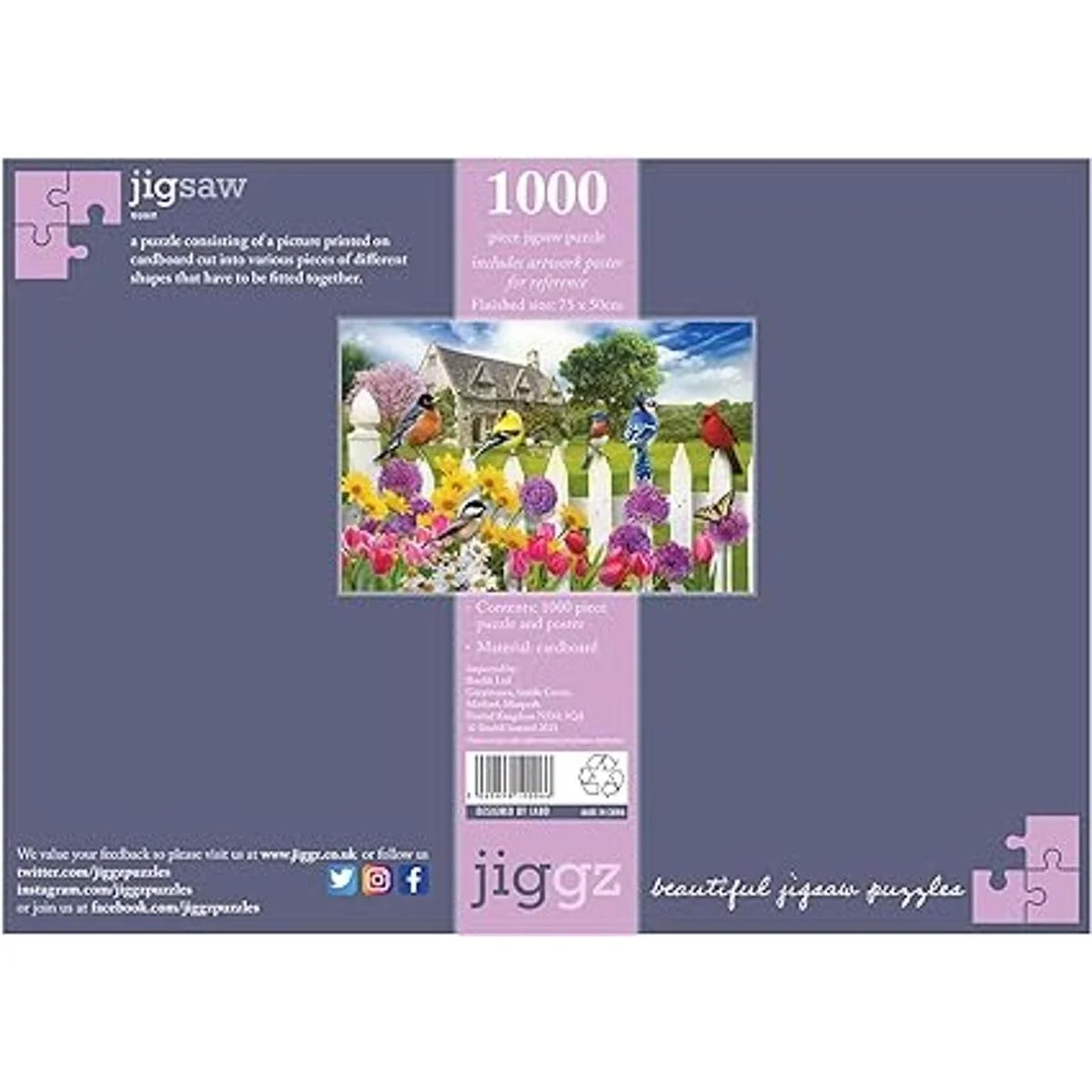 Jiggz Garden Birds Rompecabezas prémium de 1000 piezas, cada pieza es única, juego familiar divertido para adultos, casa de campo, animales lindos, flores