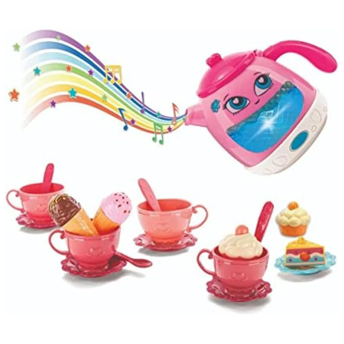 Juego completo de fiesta de té: el juego de fiesta de té Jimbalaya incluye 18 accesorios, incluyendo 1 tetera de canto con luces que reproduce canciones y hace sonidos de vertido, 4 tazas, 4 cucharaditas, 5 platos pequeños, 2 conos de helado, 1 pastel y 1 cupcake