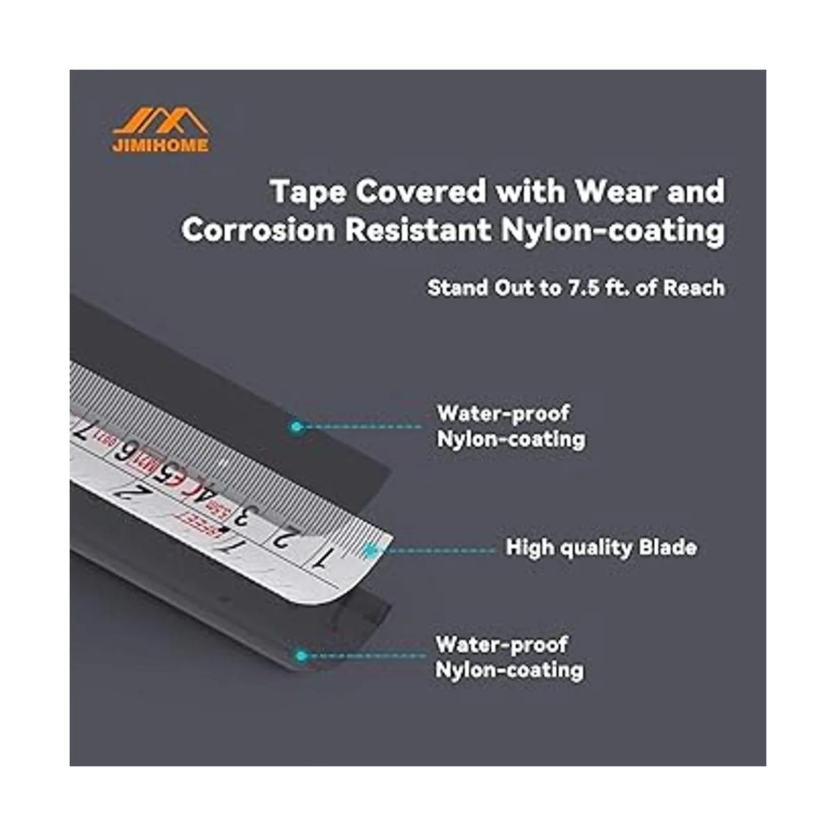 Esta cinta métrica compacta JIMIHOME de 18 pies está equipada con una hoja de protección de revestimiento de nailon resistente al desgaste y a la corrosión y un marco reforzado resistente a los impactos para mayor resistencia y durabilidad.
