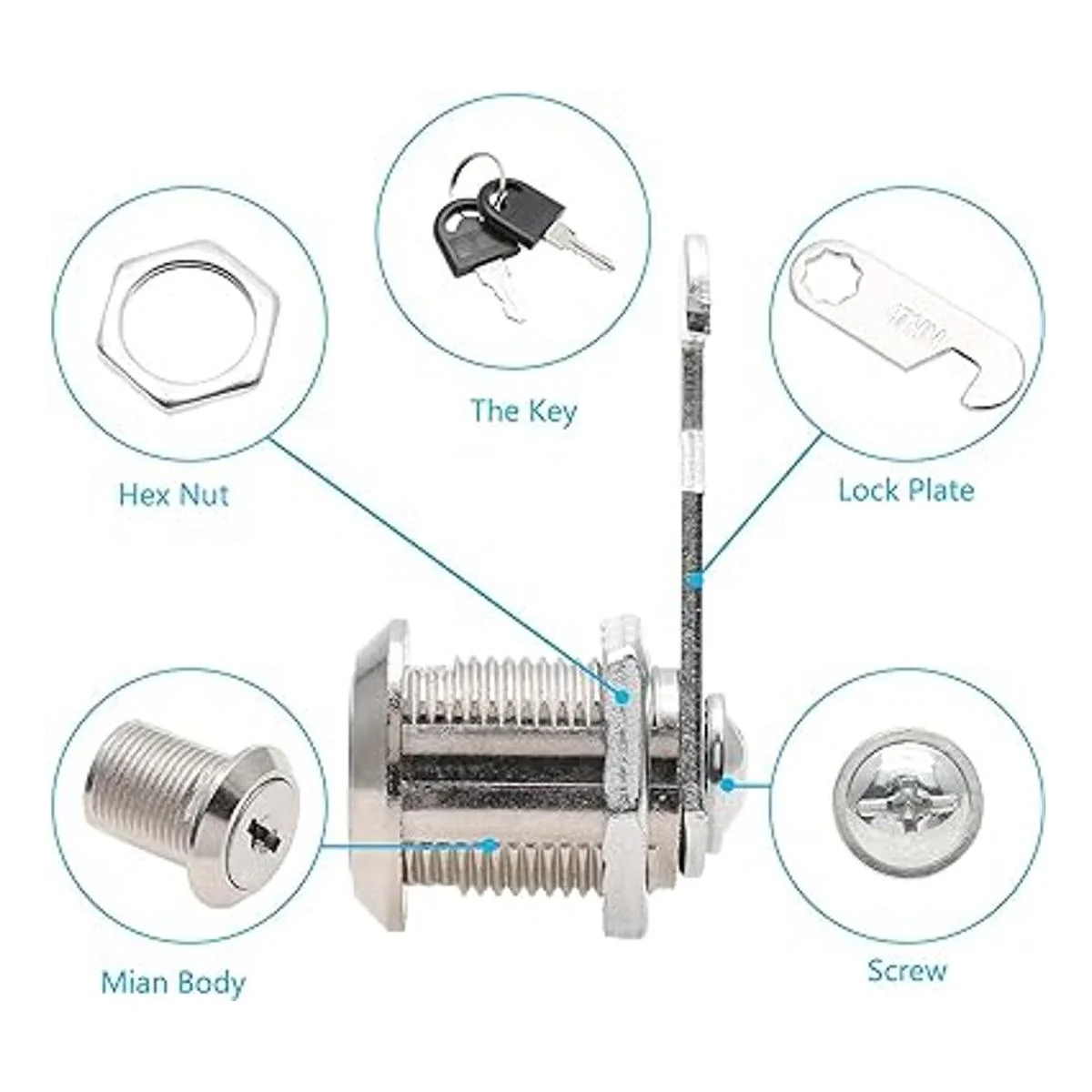 Contenido del paquete: 5 cerraduras de cilindro, 10 llaves, 5 placas de bloqueo, 5 tuercas hexagonales, 5 tornillos.