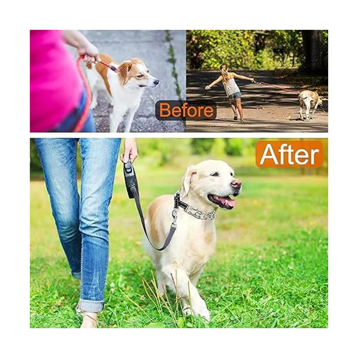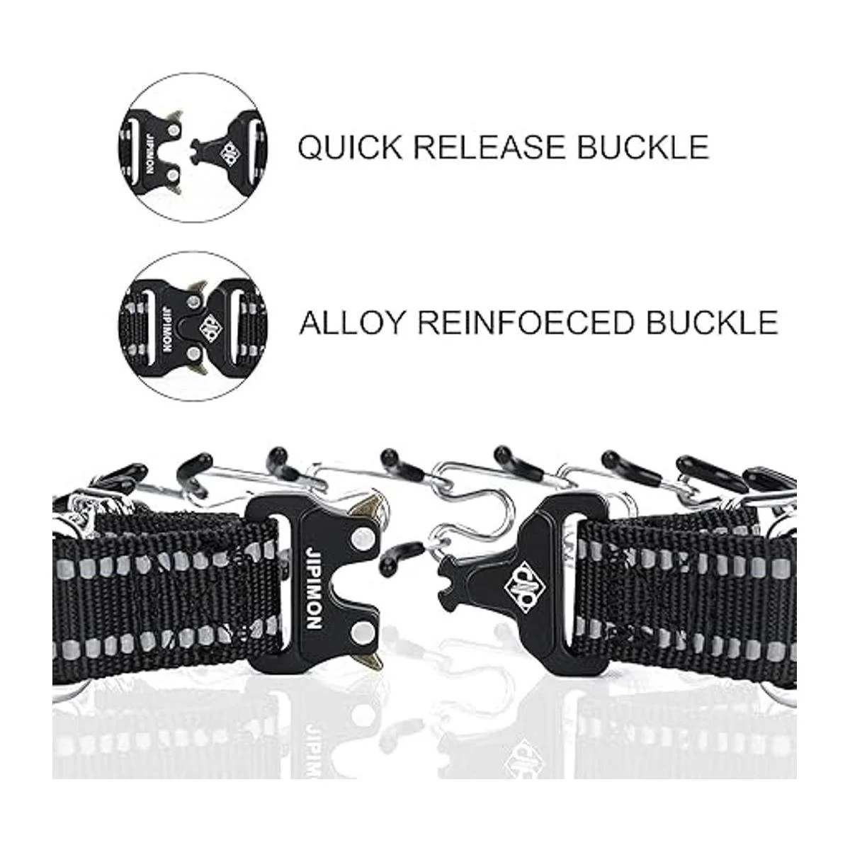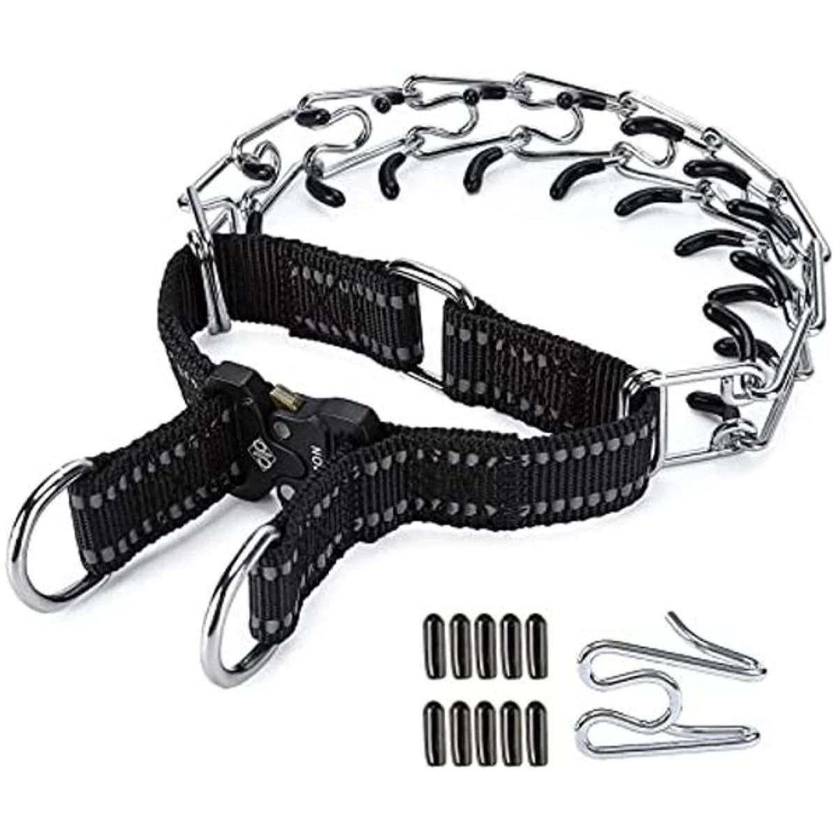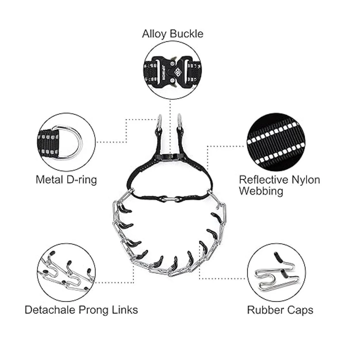 Seguro y duradero: el collar de perro está hecho de acero inoxidable de alta calidad y nailon de alta densidad con correas reflectantes. Duradero y no se decolora, suave y redondo para garantizar que no llegue daño a tu mascota, y proporciona una suave sensación de pellizco para entrenarlos, lo que es similar a cómo una madre perro corrige a sus cachorros usando sus dientes, y también puede garantizar que tu mascota tire significativamente menos mientras caminas
