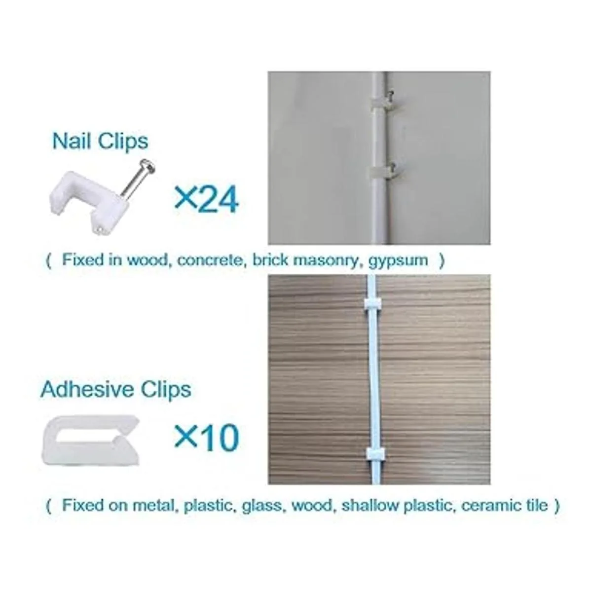 Clips extralargos, delgados y adhesivos: el cable plano es lo suficientemente largo y delgado como para pasar a través del pequeño espacio de puertas y ventanas, y los clips adhesivos adicionales se pueden utilizar en lugares lisos que no son adecuados para clavos