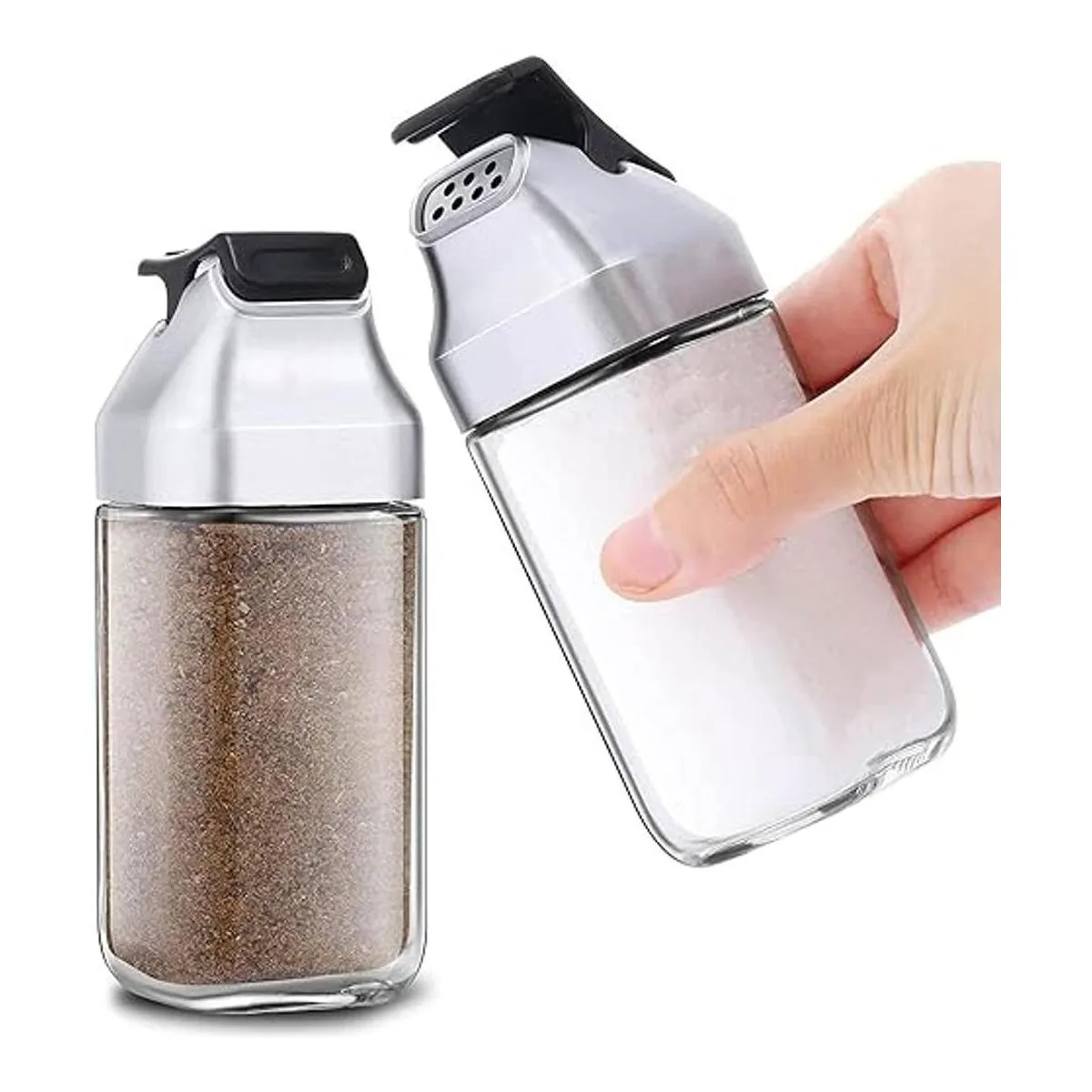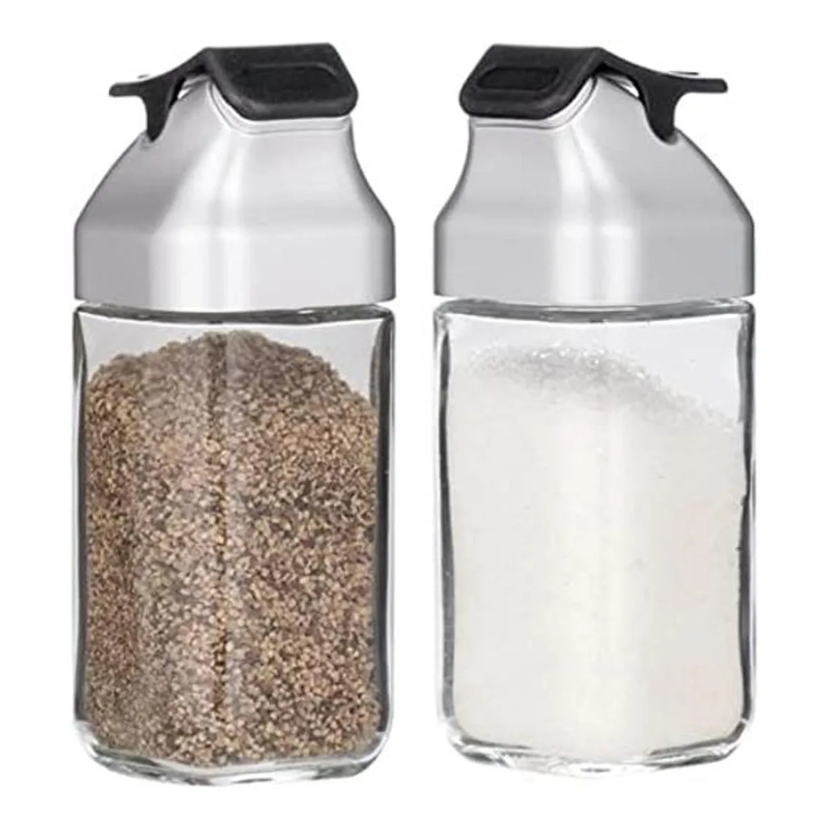 JM Design Juego de 2 saleros y pimenteros de vidrio con tapa abatible de plástico sin humedad para encimera de cocina o uso de condimentos de especias de viaje, dispensador de botellas recargables