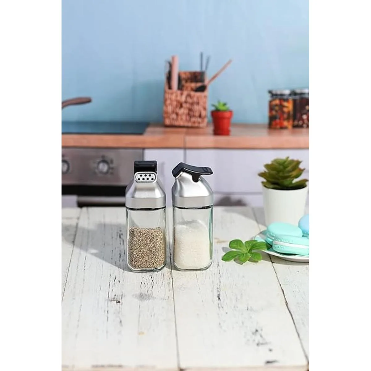 Diseño elegante: añade este elegante y moderno dispensador de sal a tu encimera para una actualización inmediata al diseño general de tus cocinas, además de la comodidad de tener tu sal y pimienta disponibles para ti en todo momento.