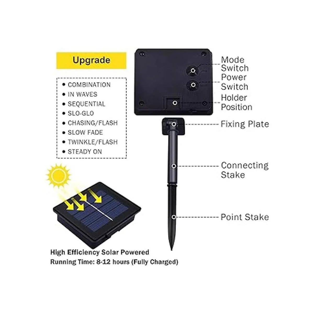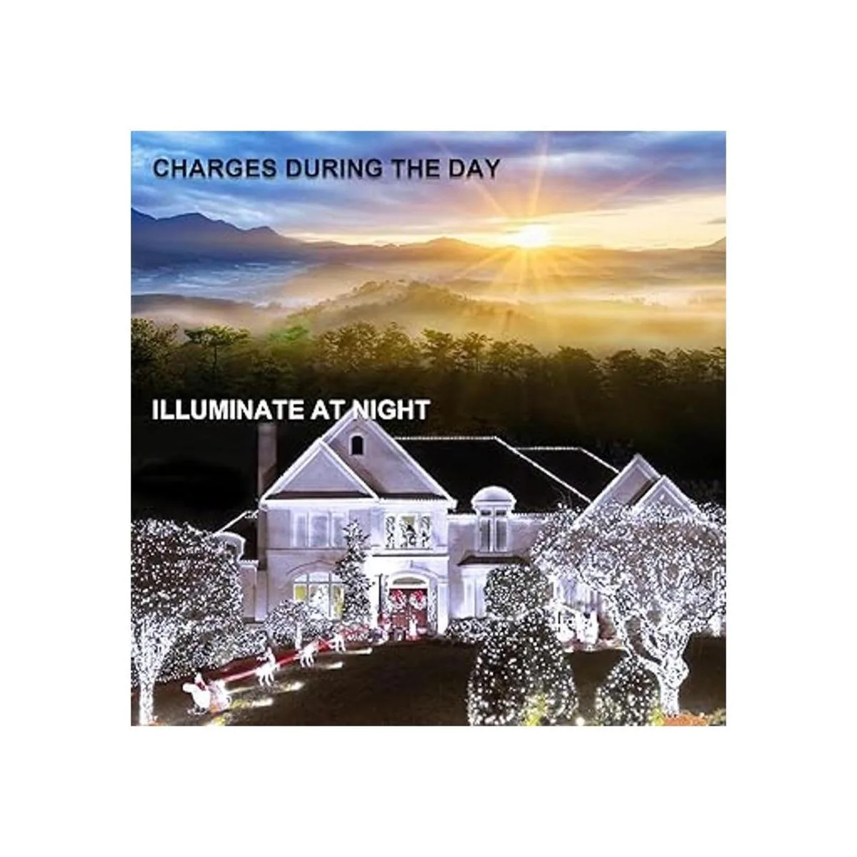 8 modos y función de memoria de luz solar de Navidad: 8 modos combinación, en onda, secuencial, slo glo, persecución/flash, lento desvanecimiento, parpadeo/flash, y constante. Un chip de memoria integrado ahorra tu última configuración de modo sin tener que restablecer el modo todos los días. Una es la combinación el primer modo, los otros modos parpadearán cíclicamente; otros 7 modos se fijan, puedes pulsar el botón hasta el modo que te guste, por lo que las luces permanecerán en el modo especificado.